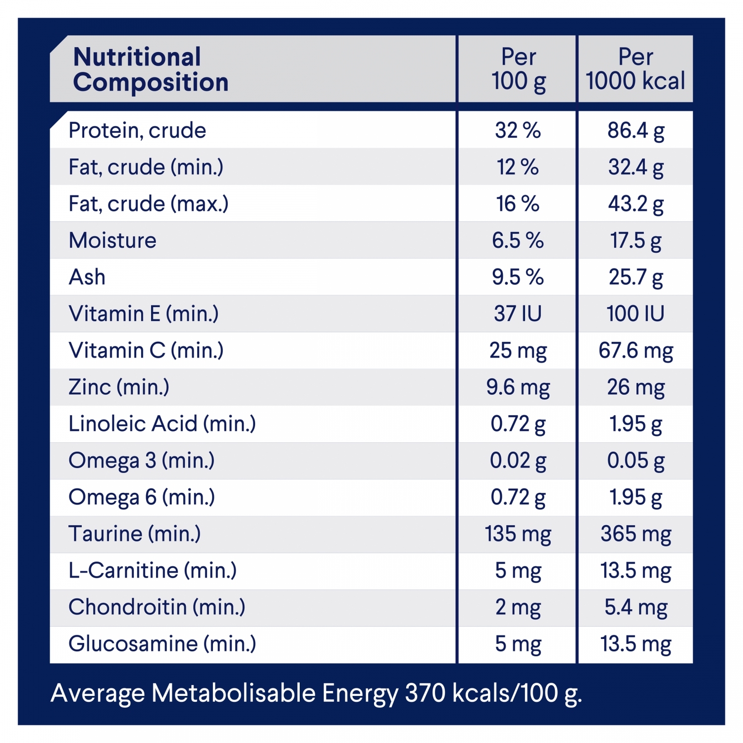 Nutritional Composition Per 100g Per 1000 kcal Protein crude 32% 86.4 g Fat, crude (min.) 12% 32.4 g Fat, crude (max.) 16% 43.2 g Moisture 6.5% 17.5 g Ash 9.5% 25.7 g Vitamin E (min.) 37IU 100IU Vitamin C (min.) 25mg 67.6mg Zinc (min.) 9.6mg 26mg Linoleic Acid (min.) 0.72g 1.95g Omega 3 (min.) 0.02g 0.05g Omega 6 (min.) 0.72g 1.95g Taurine (min.) 135 mg 365mg L-Carnitine (min.) 5 mg 13.5mg Chondroitin (min.) 2mg 5.4mg Glucosamine (min.) 5mg 13.5mg