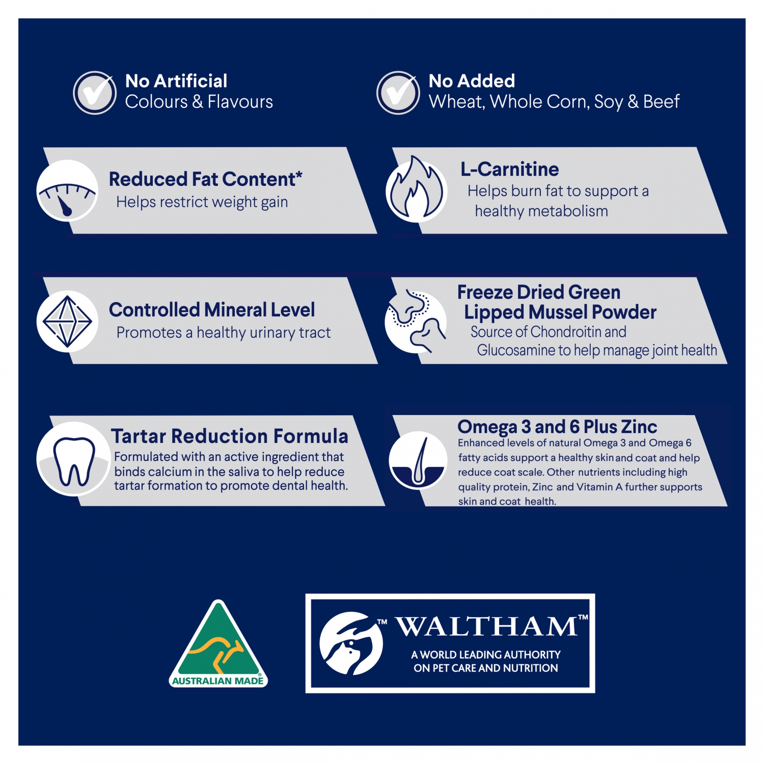 Chicken Meal; Rice; Maize Gluten; Chicken Fat; Sorghum; Natural Flavour (Chicken); Turkey Meal; Salt; Vitamins and Minerals; Dried Beet Pulp; Sunflower Oil; Sodium Tripolyphosphate; Amino Acids (incl Taurine and Methionine); Antioxidants; Green Lipped Mussel Powder; L-Carnitine.