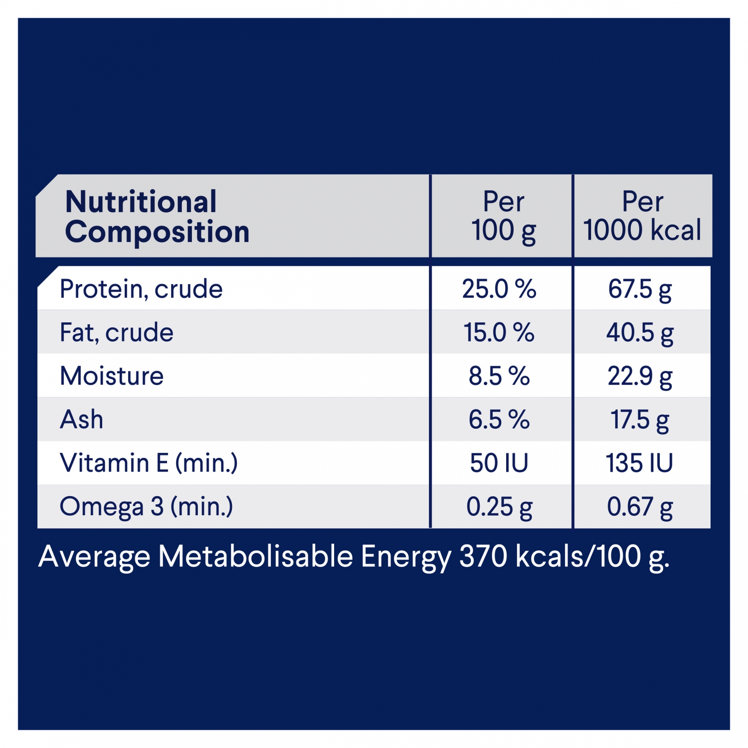 Nutritional Composition Per 100g Per 1000 kcal Protein crude 25.00% 67.5 g Fat, crude 15.00% 40.5 g Moisture 8.50% 22.9 g Ash 6.5% 17.5 g Vitamin E (min.) 50 IU 135 IU Omega 3 (min.) 0.25 g 0.67 g