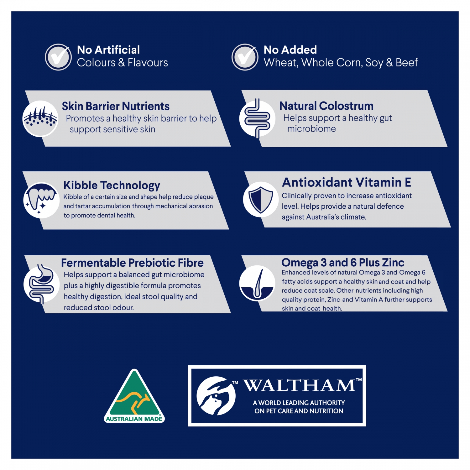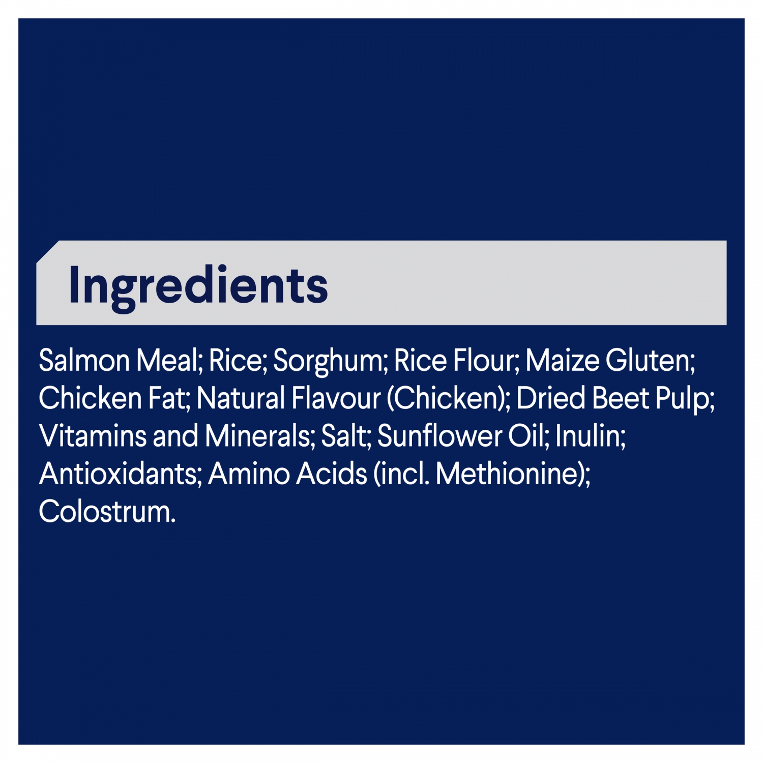 Salmon Meal; Rice; Sorghum; Rice Flour; Maize Gluten; Chicken Fat; Natural Flavour (Chicken); Dried Beet Pulp; Vitamins and Minerals; Salt; Sunflower Oil; Inulin; Antioxidants; Amino Acids (incl. Methionine); Colostrum.
