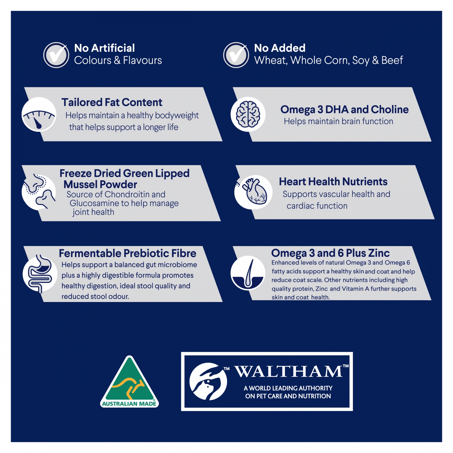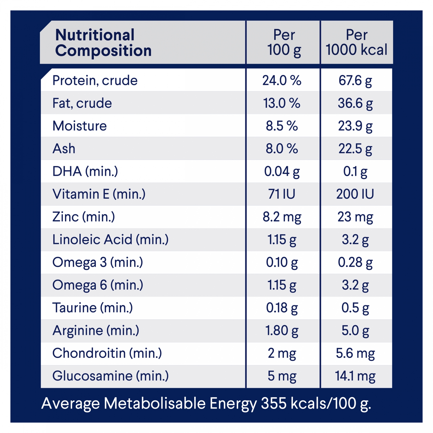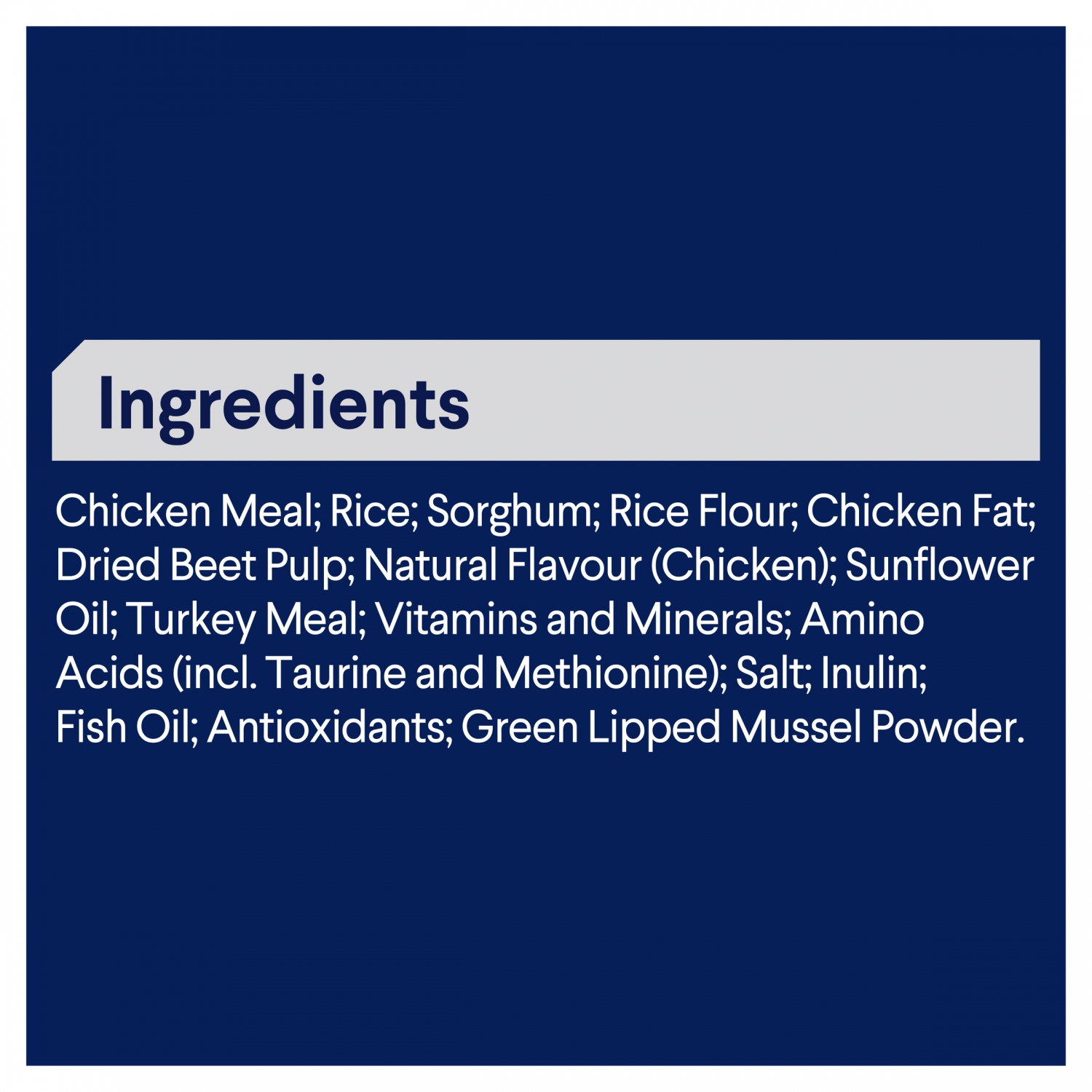 Chicken Meal; Rice; Sorghum; Rice Flour; Chicken Fat; Dried Beet Pulp; Natural Flavour (Chicken); Sunflower Oil; Turkey Meal; Vitamins and Minerals; Amino Acids (incl. Taurine and Methionine); Salt; Inulin; Fish Oil; Antioxidants; Green Lipped Mussel Powder.