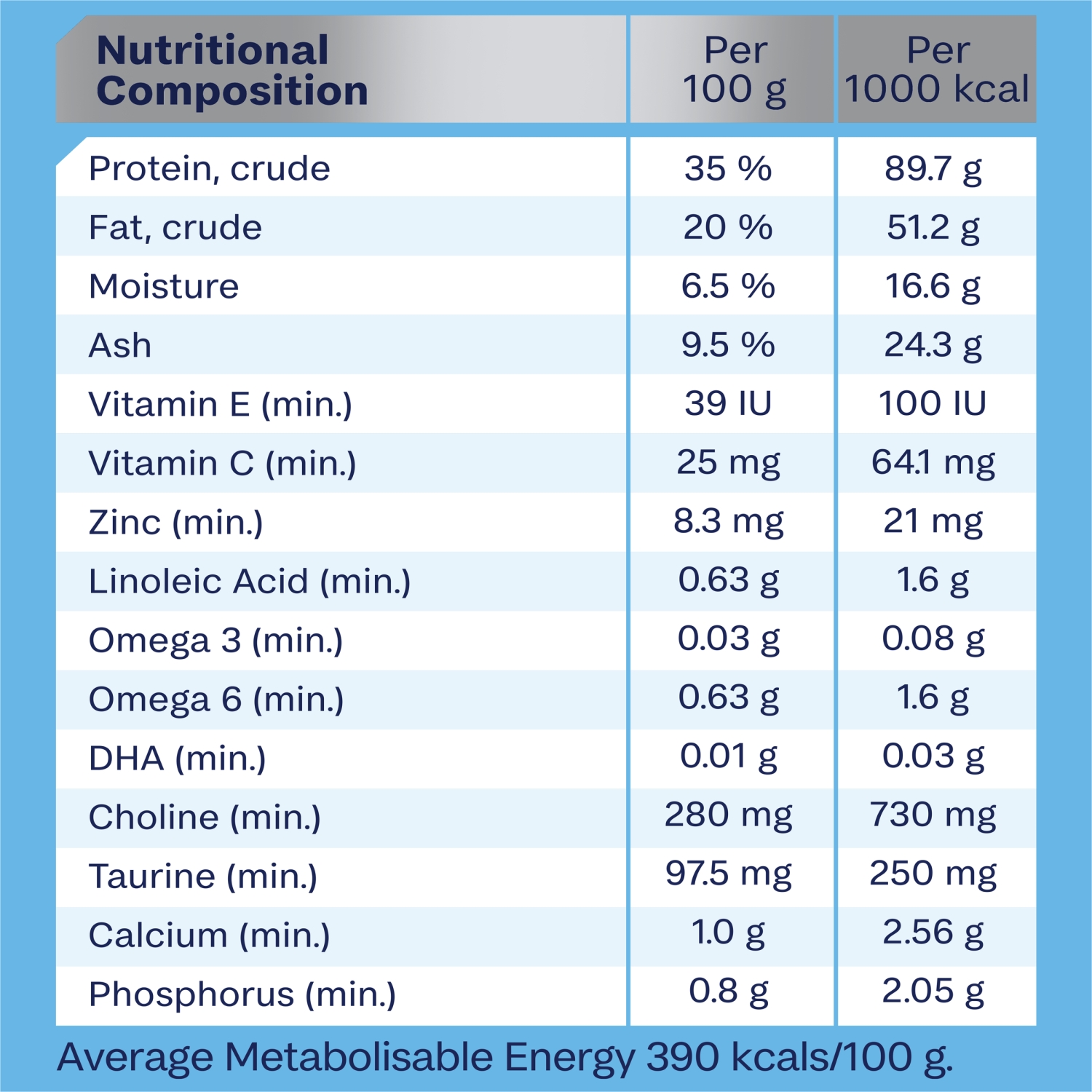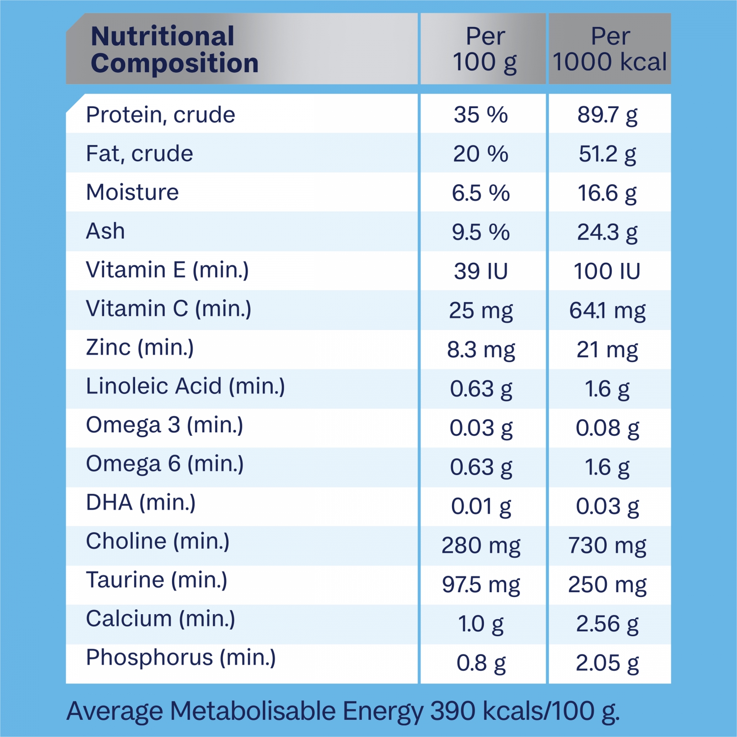 Nutritional Composition Per 100g Per 1000 kcal Protein crude 35% 89.7 g Fat, crude 20% 51.2 g Moisture 6.5% 16.6 g Ash 9.5% 24.3g Vitamin E (min.) 39IU 100IU Vitamin C (min.) 25mg 64.1IU Zinc (min.) 8.3mg 21mg Linoleic Acid (min.) 0.63g 1.6g Omega 3 (min.) 0.03g 0.08g Omega 6 (min.) 0.63g 1.6g DHA(min.) 0.01g 0.03g Choline(min.) 730mg 1870mg Taurine (min.) 97.5mg 250mg Calcium(min.) 1.0g 2.56g Phosphotus(min.) 0.8g 2.05g