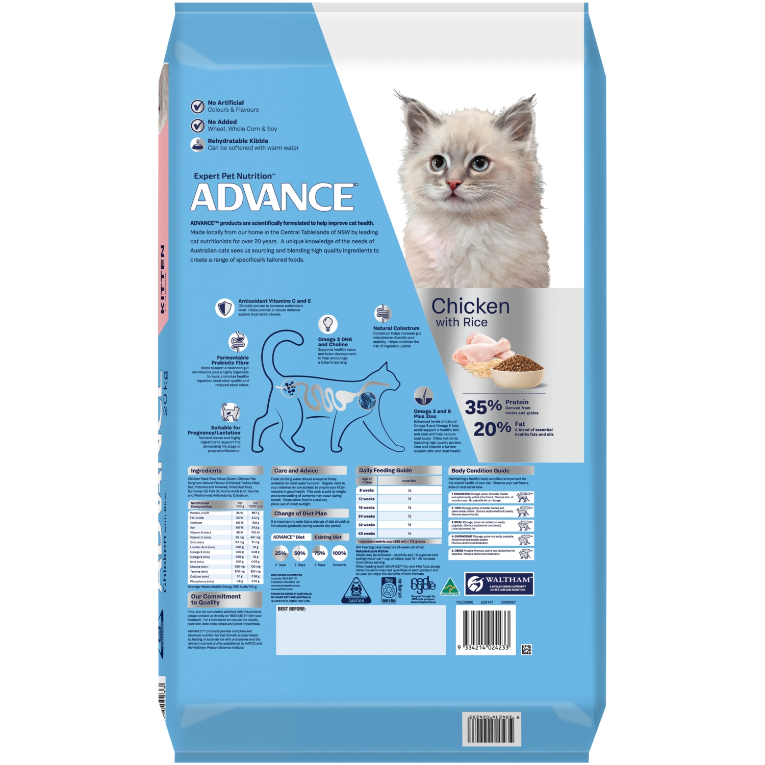 347 Feeding days based on 24 kg adult cat inactive feeding guide. When feeding both ADVANCE™ Dry and Wet food, simply halve the recommended quantities of each product and let your pet enjoy the benefits of both formats.
