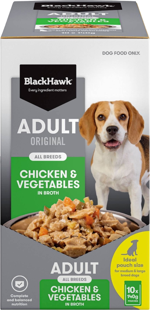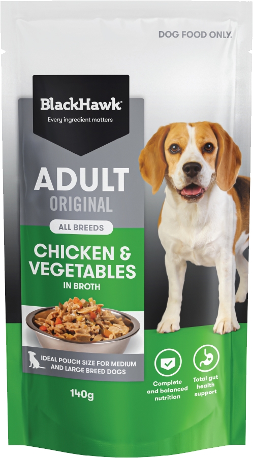 As a pet parent, it’s natural to want to offer your dog a range of textures and flavours. Black Hawk’s new Chicken and Vegetables has been specifically designed to help keep mealtimes interesting, without compromising your dog’s balanced nutrition. The wet food is served in a rich and delicious broth, and includes nutritious vegetables and chicken, a highly digestible and versatile protein that’s packed with amino acids essential for building strong bones and muscles.