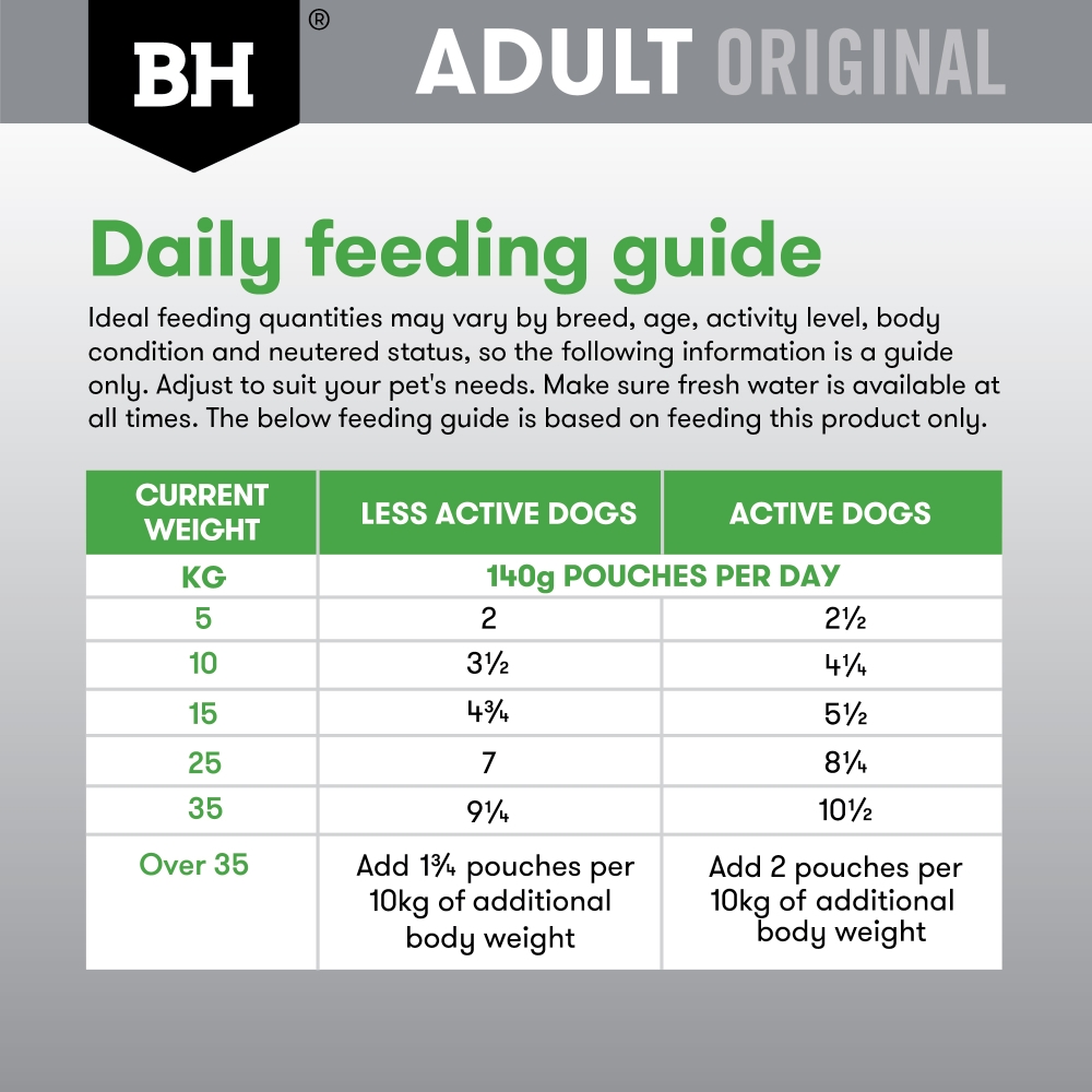 | Over 35 | Add 1 3/4 pouches per 10kg of additional body weight | Add 2 pouches per 10kg of additional body weight |
