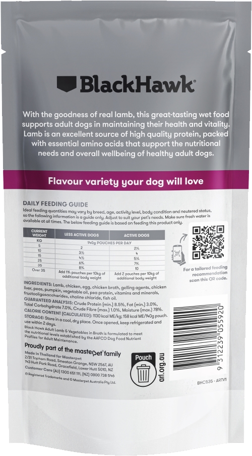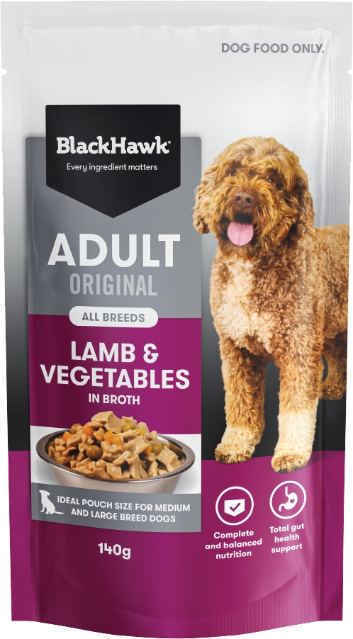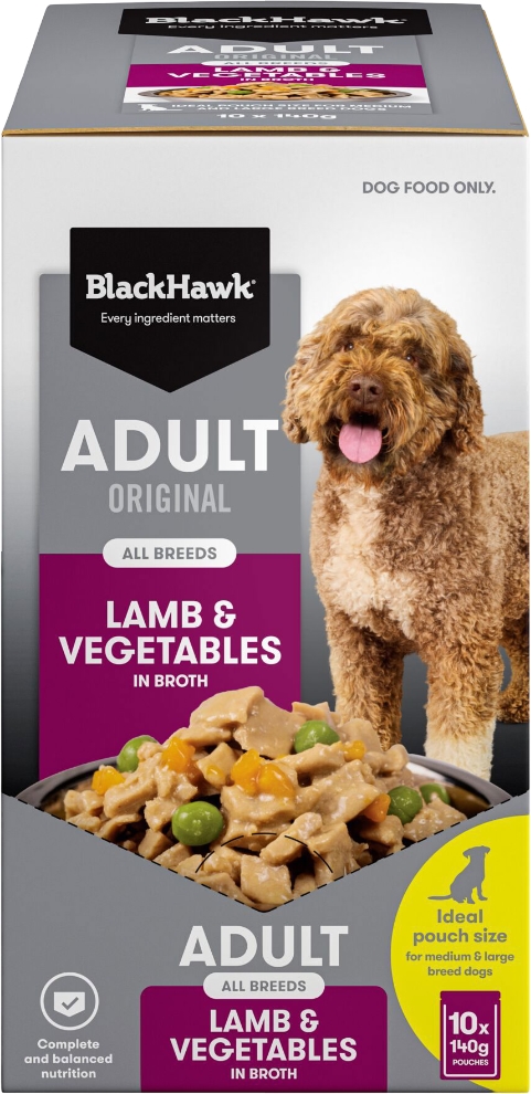 As a pet parent, it’s natural to want to offer your dog a range of textures and flavours. Add variety to your dog’s mealtimes with Black Hawk Original Adult Lamb and Vegetables wet food. This wet food range has been specifically designed to help you keep mealtimes interesting, without compromising your dog’s balanced nutrition. It is served in a rich and delicious chicken broth and includes nutritious vegetables and lamb, a highly digestible protein rich in iron and vitamin B12, which may assist your dog’s heart health.