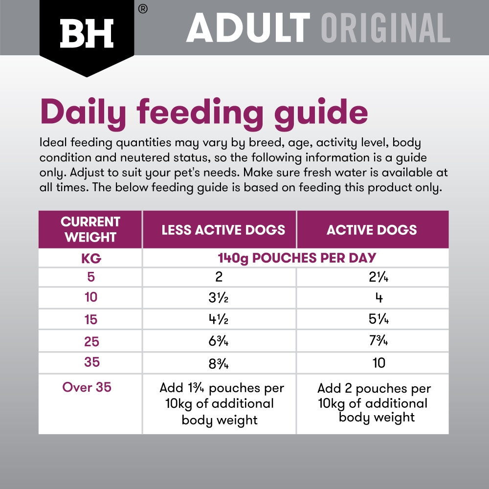 For medium - large breed dogs: we recommend using these 140g pouches. For each 1 x 140g pouch you feed per day, we recommend reducing the amount of kibble by 42g.
