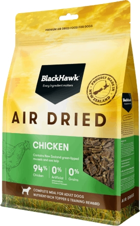 Made with 94% real New Zealand chicken, including liver, this Black Hawk Air Dried dog food is a highly nutritious, complete and balanced diet for adult dogs. Gently air dried at low temperatures, it naturally preserves essential nutrients while enhancing the flavour and taste of the ingredients.
