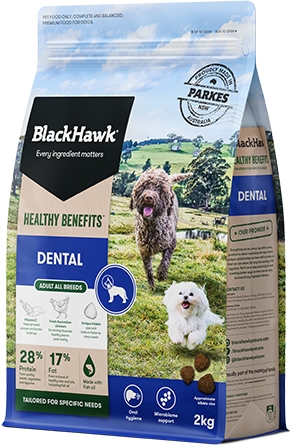 Black Hawk Healthy Benefits Dental has been developed for your adult dog’s oral health. The tear-drop kibble size and fibrous plant-based ingredients create a tooth-friendly texture that aims to clean your dog’s teeth while they chew. Vitamin C is included as an antioxidant and to help to prevent plaque and tartar build-up.
