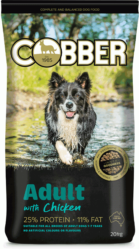Cobber Adult with Chicken is formulated with 25% protein and 11% fat, with no artificial colours or flavours, in a delicious chicken flavour that dogs love, and is suitable for all breeds of adult dogs 1-7 years. Built with Cobber’s Inner Goodness, a unique combination of vitamins and minerals, postbiotic and functional fibres, your dog will be kept happy on the outside and healthy on the inside.