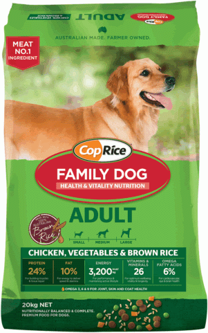 • CopRice Family Dog Food is a complete and balanced feed but can be fed in conjunction with canned or fresh meat. Ensure that overfeeding does not occur.