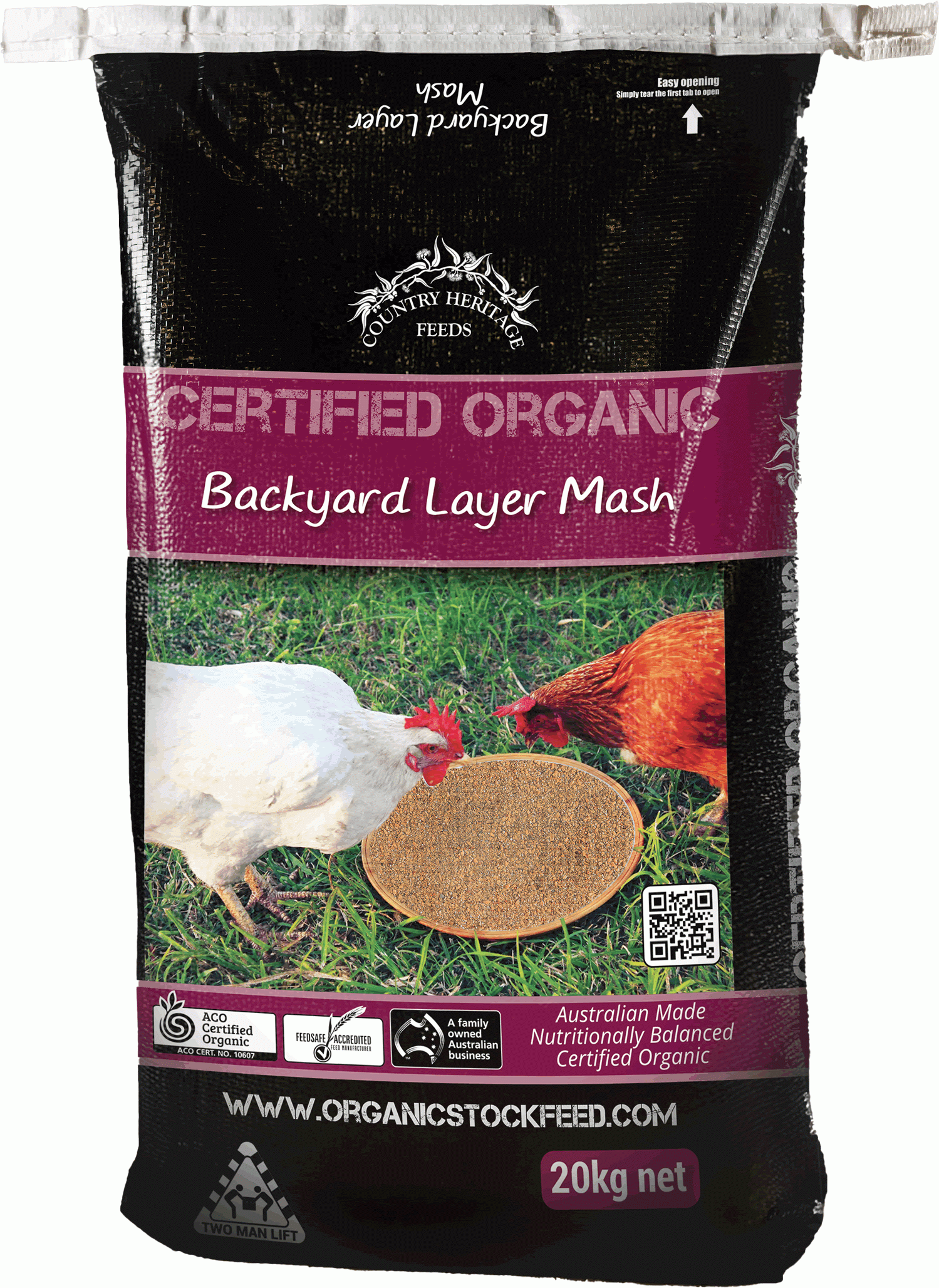 Country Heritage Feeds Certified Organic Backyard Layer is formulated for laying birds. (approx 18 – 20 weeks). It is advisable to blend layer feed with Country Heritage Feeds Certified Organic Chicken Starter Grower feed from 16 weeks to introduce layer feed to pre-layers and to assist with transition onto the layer feed as the bird reaches maturity.