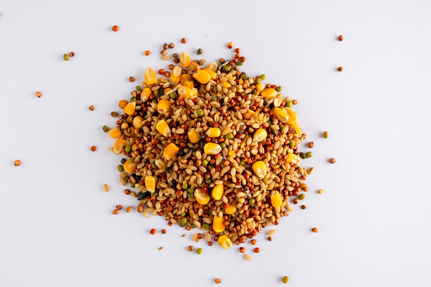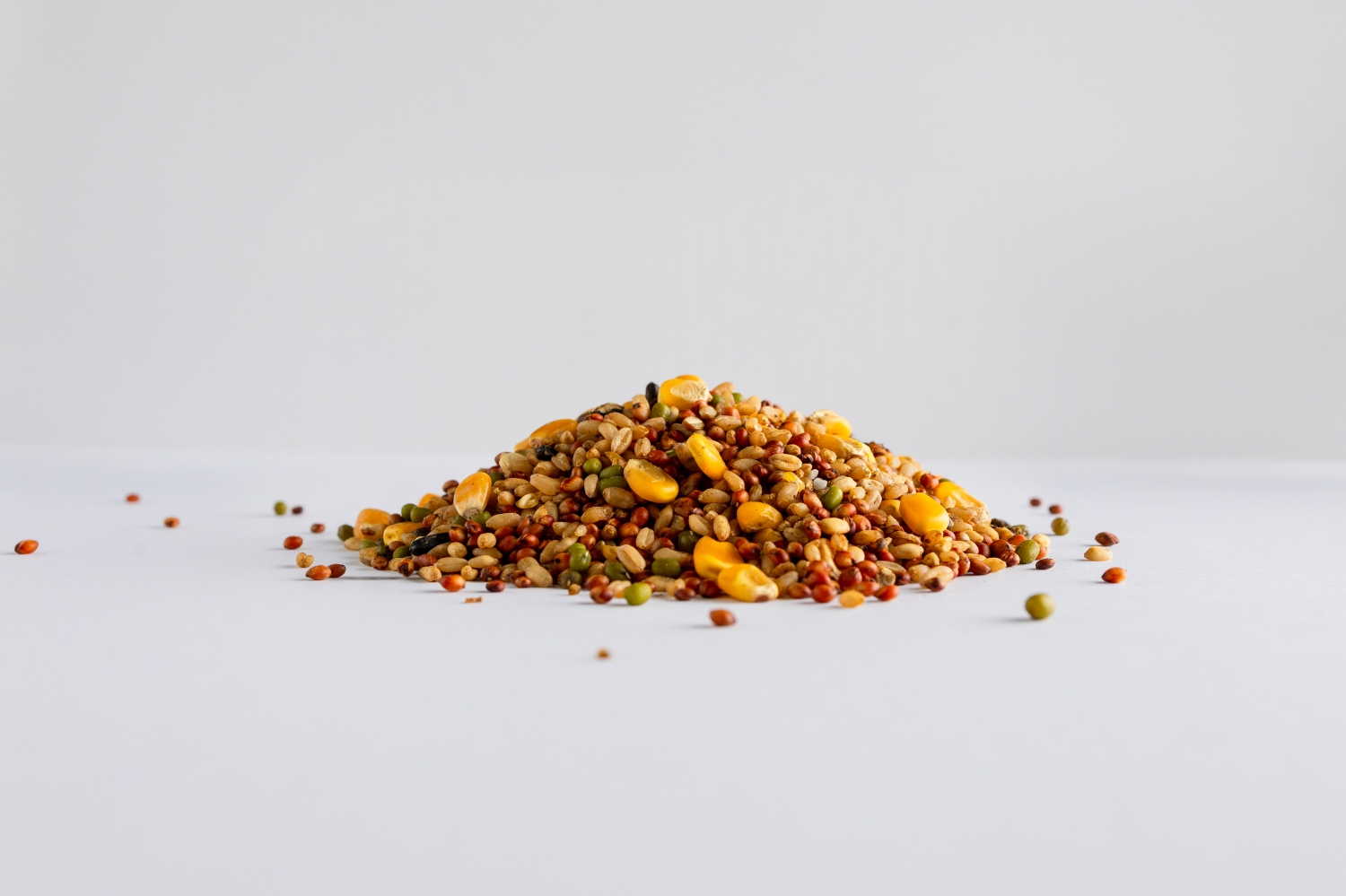 A blend of certified organic whole grains. Typical ingredients include wheat, sorghum, corn, sunflower seeds, and mung beans, with variations depending on seasonal availability.