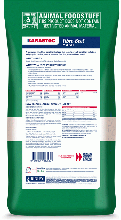 As a horse feed, Barastoc Fibre-Beet™ Mash provides all the essential elements for safe conditioning;