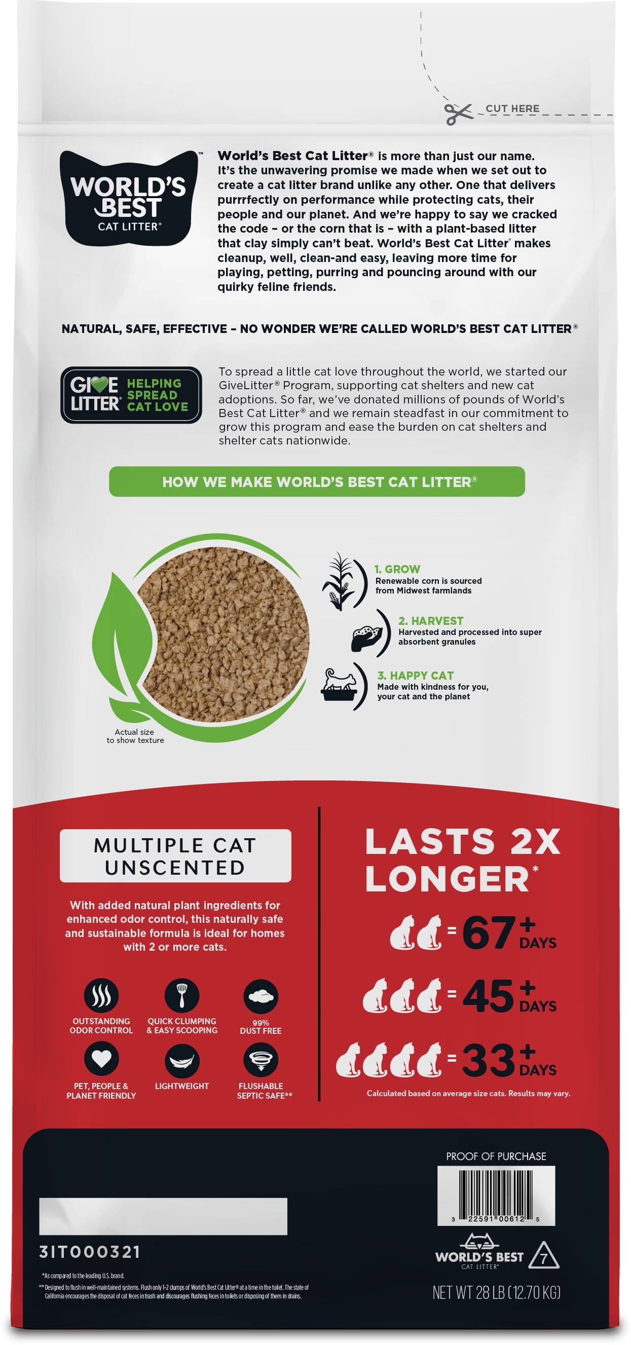 Made with a natural plant ingredient for even more outstanding odor control, this multiple cat clumping litter is easy to scoop and proven flushable* for simple cleanup! Having more than one cat shouldn’t mean you have more to worry about it. Your cats deserve the best clumping cat litter. So get more out of every bag with 2X longer-lasting performance than the leading US litter brand.
