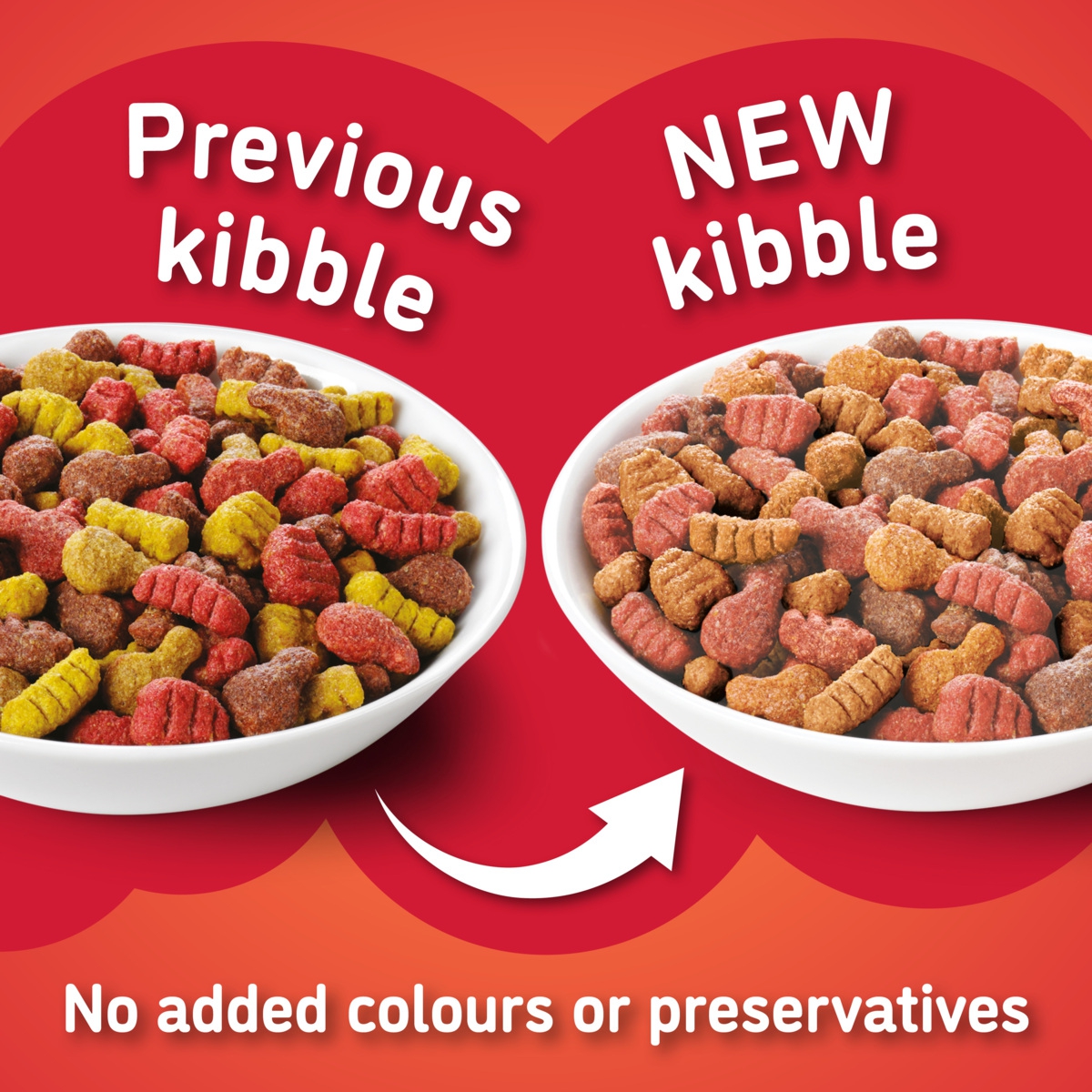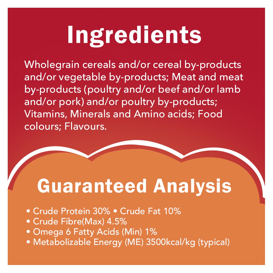 Wholegrain cereals and/or cereal by-products and/or vegetable by-products; Meat and meat by-products (poultry and/or beef and/or lamb and/or pork) and/or poultry by-products; Vitamins, Minerals and Amino acids; Food colours; flavours.