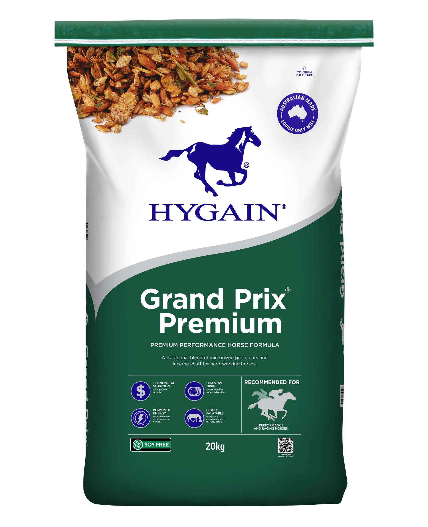 HYGAIN® GRAND PRIX® is a blend of the following quality ingredients: Cooked and Flaked Oats, MICRBARLEY®, MICRMAIZE®, MICRLUPINS®, RBO® (Rice Bran Oil including Omega essential fatty acids and Natural Anti-Oxidants), Natural Vitamin E, Lucerne and Oaten Chaff, Molasses, Salt, Calcium Carbonate, Di-Calcium Phosphate, Lysine, Bio-Available Selenium, Bio-Available Chromium and HYGAIN® Vitamin and Chelated Mineral Premix. Natural Vitamin E – This unique and highly stable form of Natural Vitamin E known as RRR-a-tocopherol is up to 5 times more bio available and potent than regular synthetic sources of Vitamin E. Research has shown that this form of Natural Vitamin E provides higher retention levels in plasma further aiding antioxidant, immune, cardiovascular, circulatory, neuromuscular and reproductive functions. Bio-Available Selenium – Selenium acts as an antioxidant to prevent fatty acid oxidation which can cause tissue damage. Research has shown that an organic form of selenium, is more readily absorbed and retained than selenium in inorganic forms. Bio-Available Chromium – The addition of chromium to performance horse diets has been shown to reduce the build up of lactic acid at the end of strenuous exercise or the closing stages of a race and to increase the horse’s ability to store glucose. HYGAIN® RBO® – RBO® Equine Performance Oil® is a blend of rice bran oil, omega essential 3,6 & 9 fatty acids and natural anti-oxidants known to improve the health and structural integrity of cell membranes. RBO® oil plays an important role in maximising energy efficiency due to its energy dense nature and is digested efficiently in the small intestine reducing the ‘sugar high’ associated with high grain diets. RBO® promotes growth and development of the muscular system, top line and a healthy skin and coat.