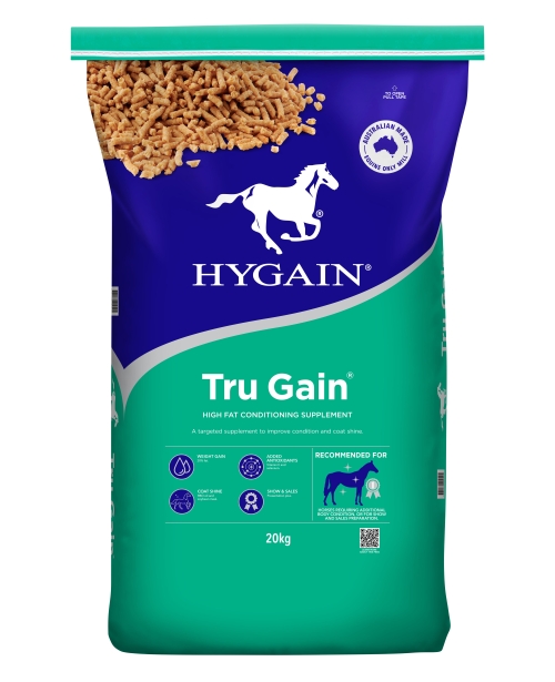 HYGAIN TRU GAIN® is a safe (slow release) and effective extruded high fat supplement, providing your horse with a cool energy source along with bio-available Vitamin E and Selenium. The increased energy density is designed to rapidly boost your horse’s body condition and assist performance horses in meeting their energy requirements. HYGAIN TRU GAIN® as an alternative energy source provides the following benefits to your horse’s diet: • Increases energy content of diet without fizz • Reduces excitability • Increases oxidative capacity in performance horses • Acts as a carrier for fat soluble vitamins HYGAIN TRU GAIN® is ideal for: • Horses that require weight gain • High Performance horses • Endurance horses • Show & sales preparation • Horses prone to Tying Up/stomach ulcers • Poor Doers • Stud horses
