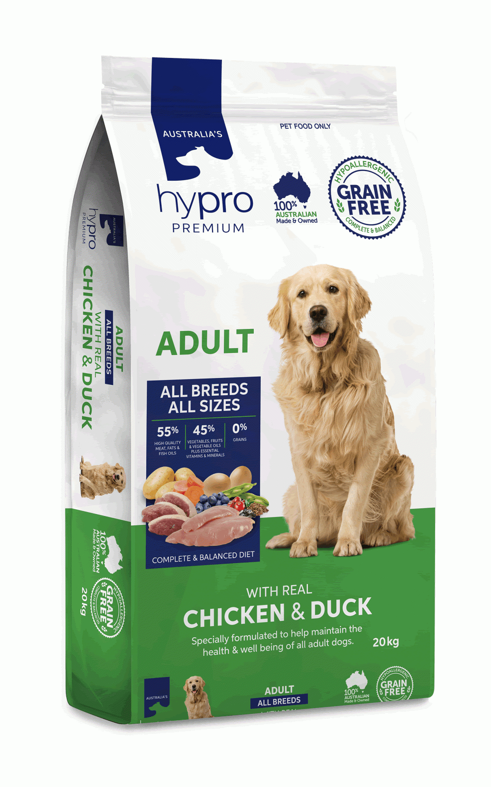 Hypro Premium is packed with 100% real and premium Australian chicken and duck, rather than the filler grain that many budget dog kibble brands use. This keeps dogs fuller for longer, meeting their individual health requirements with a balanced recipe of essential nutrients, oils, amino acids, minerals and healthy fats. Hypro Premium is Australian-made, guaranteeing the best quality of life for all dog breeds, at all stages of their life. Our kibble exceeds AAFCO standards, with the optimal balance of daily nutritional requirements. Hypro Premium is made using the finest local ingredients and superfoods, sourced from Australian farmers.