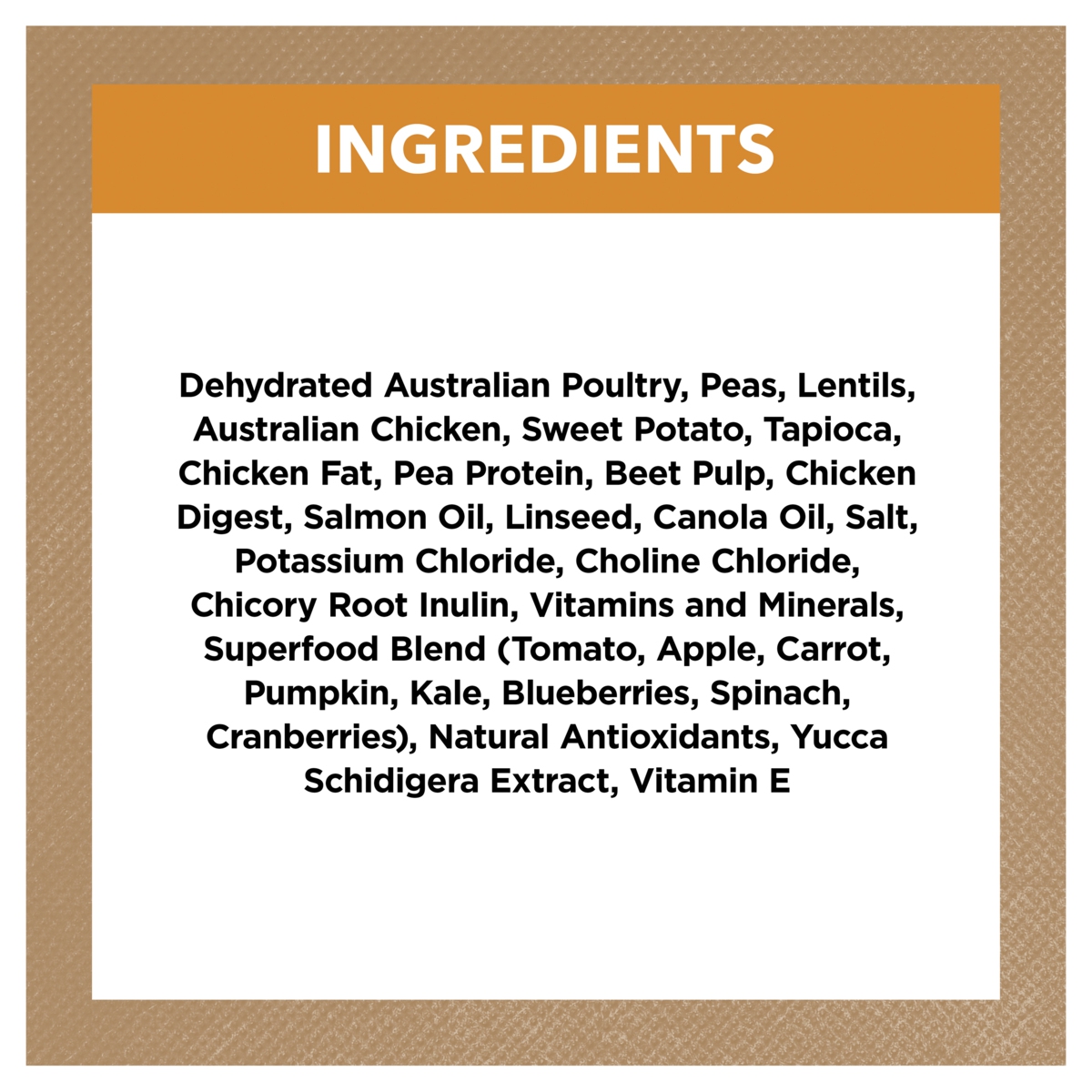 Dehydrated Australian Poultry, Peas, Lentils, Australian Chicken, Sweet Potato, Tapioca, Chicken Fat, Pea Protein, Beet Pulp, Chicken Digest, Salmon Oil, Linseed, Canola Oil, Salt, Potassium Chloride, Choline Chloride, Chicory Root Inulin, Vitamins and Minerals, Superfood Blend (Tomato, Apple, Carrot, Pumpkin, Kale, Blueberries, Spinach, Cranberries), Natural Antioxidants, Yucca Schidigera Extract, Vitamin E.