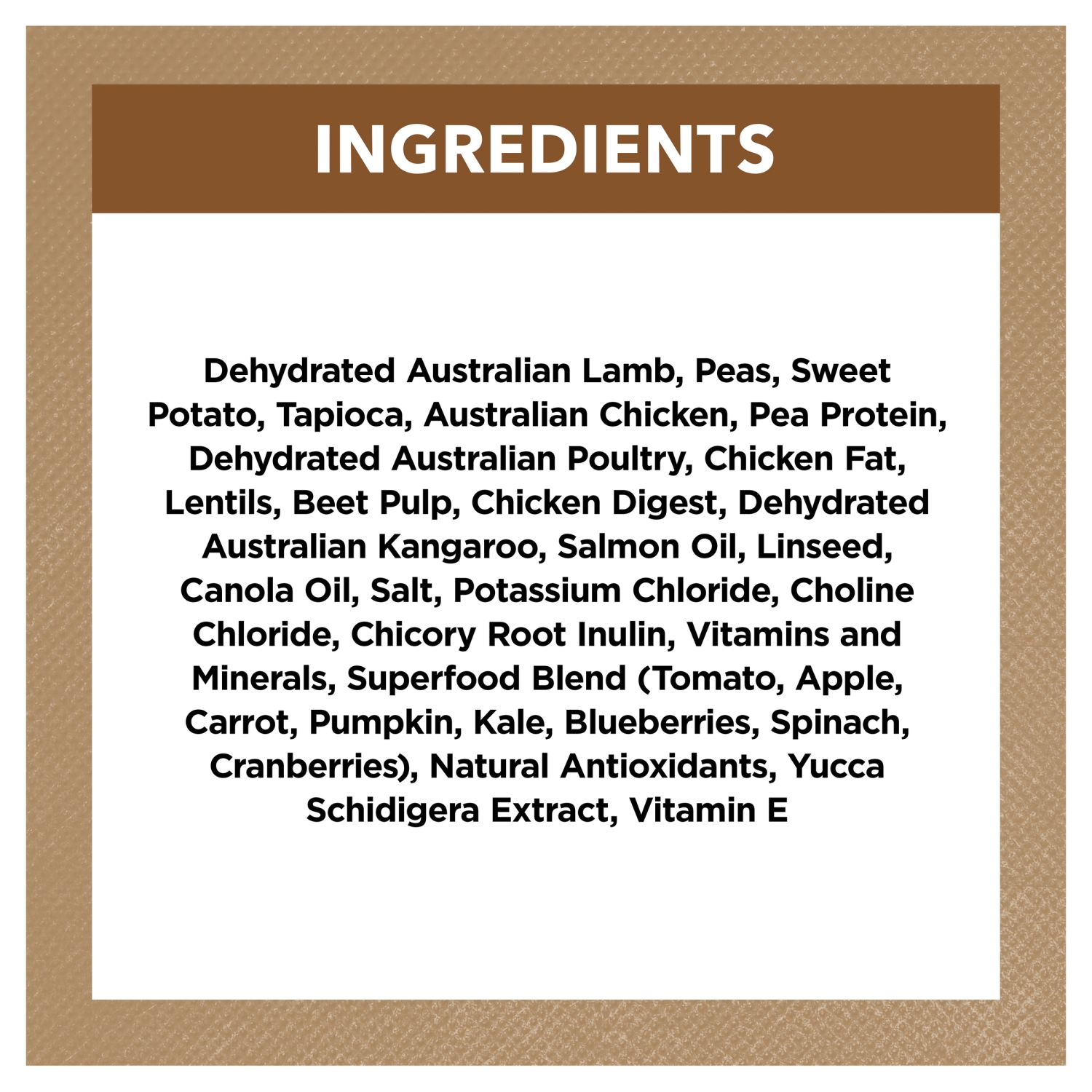 Australian meat is our #1 Ingredient to deliver quality protein for lean muscle maintenance. Kangaroo is good source of lean protein to help manage satiety & healthy energy levels & Lamb is a good source of protein and fat to help maintain muscles and support overall good health. We also use carefully selected vegetables to provide sources of grain free complex carbohydrates and fibre to help support a healthy gut. A natural superfood blend (including Tomato, Apple, Carrot, Pumpkin, Kale, Blueberries, Spinach & Cranberries) is added as a source of antioxidants, as well as Omega 3 & 6 to help support healthy skin & coat. A natural pre-biotic is also included to support healthy digestion, and essential vitamins and minerals ensure your best mate is provided with their complete daily nutrition.
