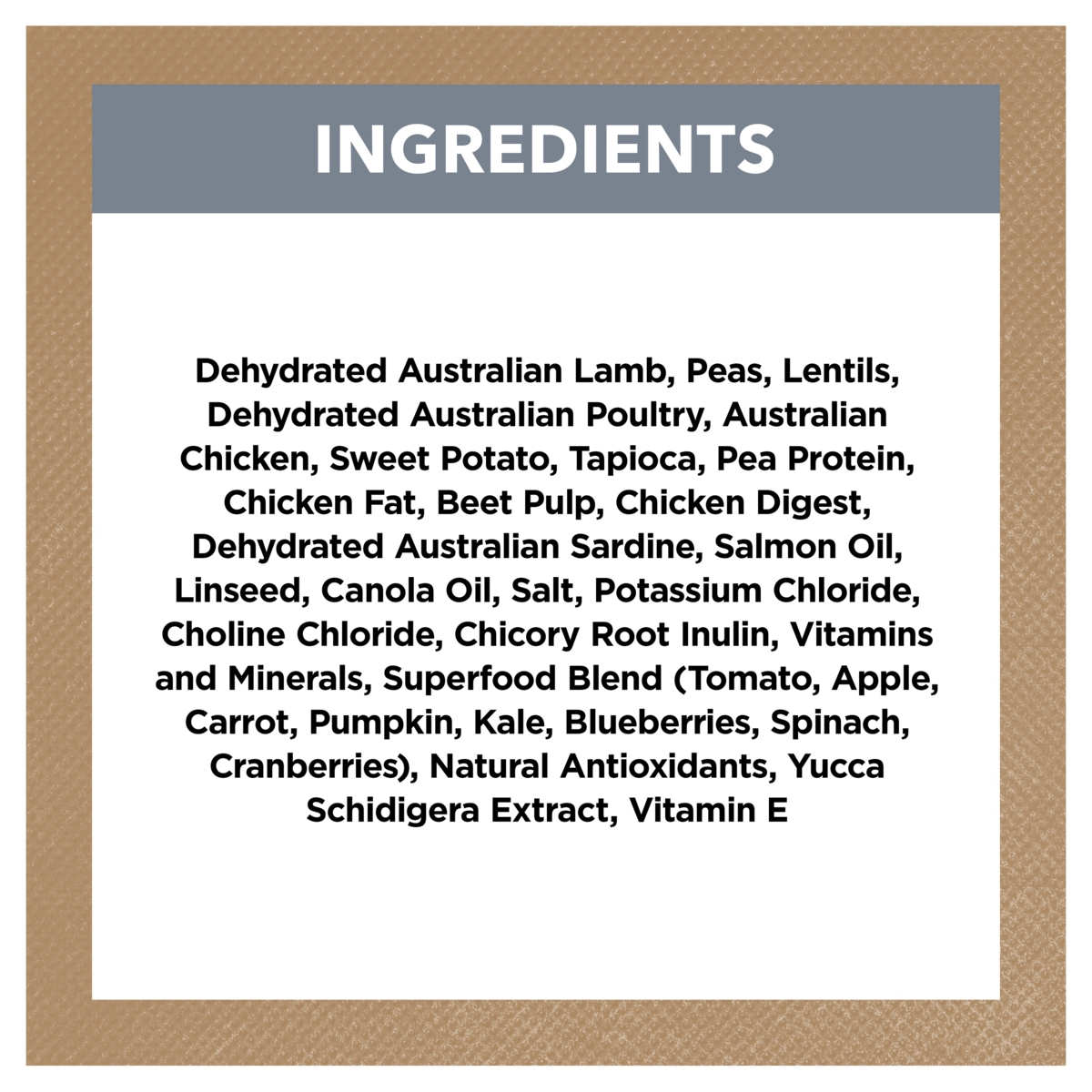Australian meat is our #1 Ingredient to deliver quality protein for lean muscle maintenance. We also use carefully selected vegetables to provide sources of grain free complex carbohydrates and fibre to help support a healthy gut. A natural superfood blend (including Tomato, Apple, Carrot, Pumpkin, Kale, Blueberries, Spinach & Cranberries) is added as a source of antioxidants, as well as Omega 3 & 6 to help support healthy skin & coat. A natural pre-biotic is also included to support healthy digestion, and essential vitamins and minerals ensure your best mate is provided with their complete daily nutrition.