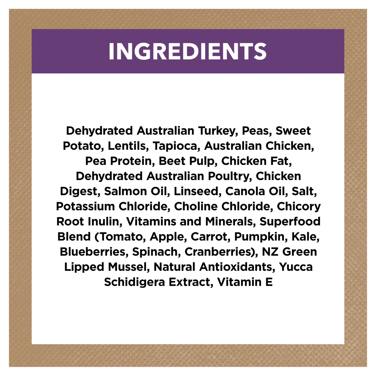 -Quality lean protein for lean muscle maintenance -Natural fibre for healthy digestion and firmer stools -Omega 3 & 6 for healthy skin and coat -Yucca for stool odour control -Natural prebiotics for the beneficial growth of healthy gut microflora -Superfoods source of antioxidants -No added artificial colours, flavours or preservatives -Meets the AAFCO nutritional guidelines for Adult Maintenance