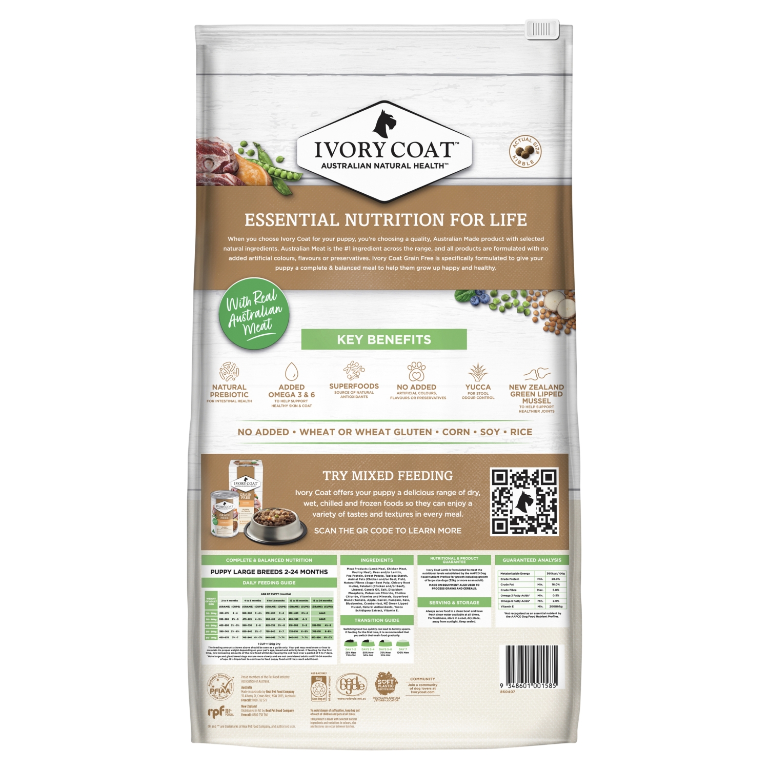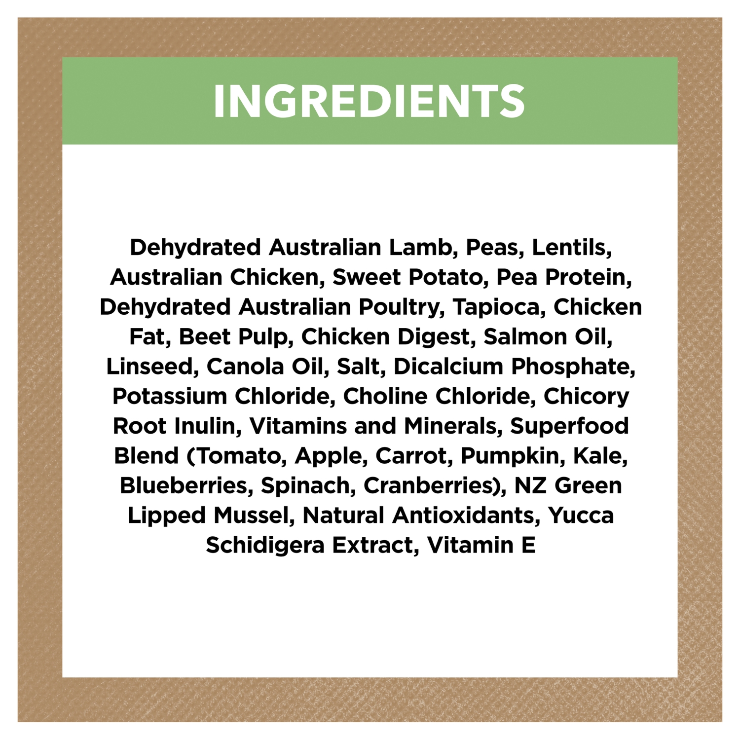 Dehydrated Australian Lamb, Peas, Lentils, Australian Chicken, Sweet Potato, Pea Protein, Dehydrated Australian Poultry, Tapioca, Chicken Fat, Beet Pulp, Chicken Digest, Salmon Oil, Linseed, Canola Oil, Salt, Dicalcium Phosphate, Potassium Chloride, Choline Chloride, Chicory Root Inulin, Vitamins and Minerals, Superfood Blend (Tomato, Apple, Carrot, Pumpkin, Kale, Blueberries, Spinach, Cranberries), NZ Green Lipped Mussel, Natural Antioxidants, Yucca Schidigera Extract, Vitamin E.
