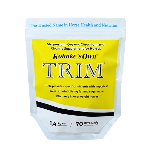TRIM contains selected nutrients balanced to very specific levels for optimum metabolism in horses and ponies. TRIM supplies trace-minerals and vitamins often lacking in rations fed to overweight horses, including magnesium, vitamin C, chromium and choline. These nutrients are included in highly active forms for the best absorption and utilisation, such as protein chelated chromium and quality vitamin C from ascorbates.