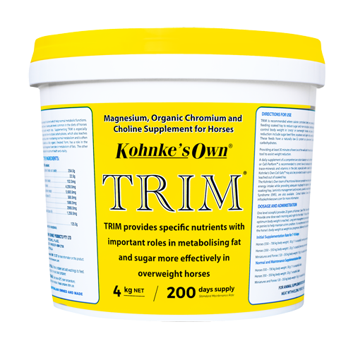 TRIM is the result of 4 years of field trials and research by Kohnke’s Own and contains nutrients which are often low or inadequate in the diets of horses and ponies on restricted rations.
