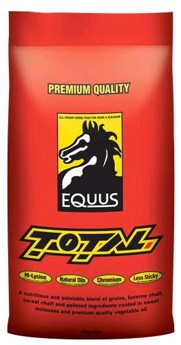 Equus Total is formulated from a selection of the following ingredients and/or their by-products: Lucerne chaff, cereal chaff, oats, rice, barley, lupins, peas, beans, canola, sunflower, bran, pollard, vegetable oil, molasses, limestone, di-calcium phosphate, bentonite, lysine, organic chromium, electrolytes, vitamins and minerals.