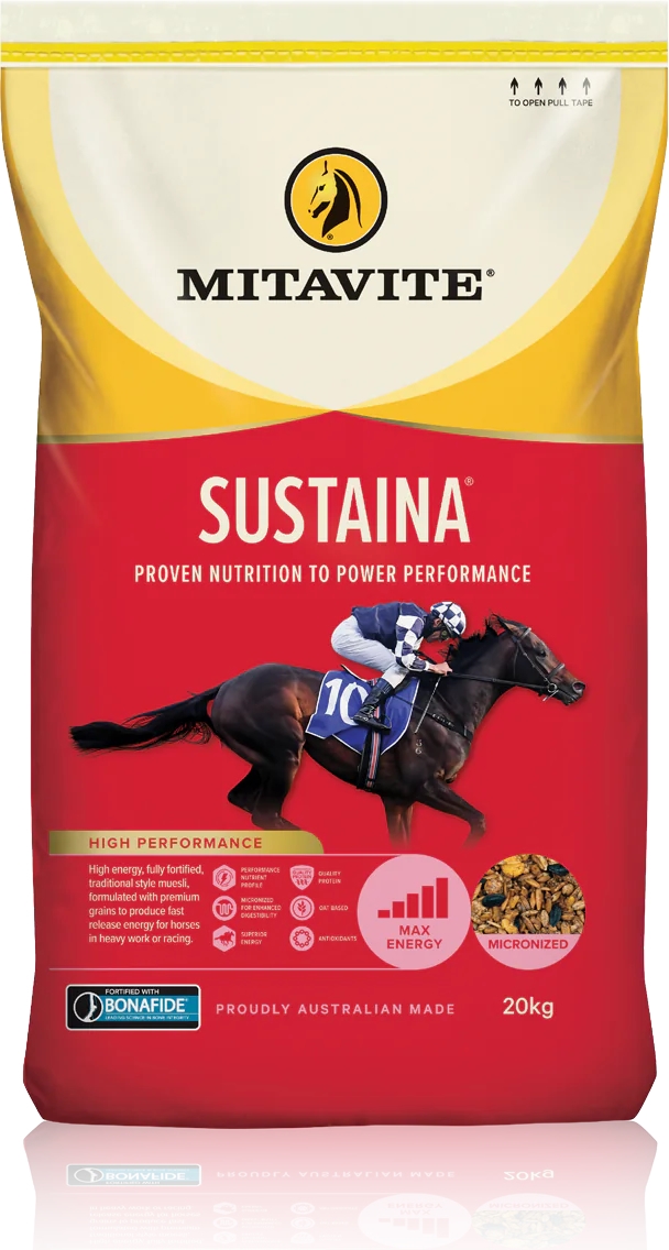 MITAVITE® SUSTAINA® provides fast-release energy from steam-flaked oats, micronized barley and micronized corn, making it ideal for horses in racing or heavy workloads. Ensure your equine athletes achieve peak performance with superior energy and optimal health by choosing SUSTAINA®.