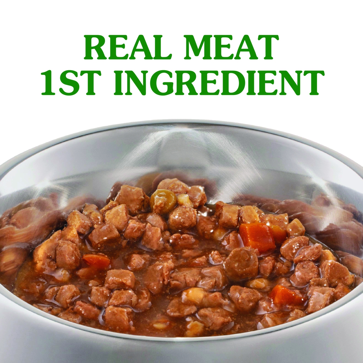Meats (chicken, and/or turkey and/or beef and/or lamb and/or pork), Vegetables (carrots, potatoes), Cereals (including rice), Gelling agents, Vitamins & Minerals, Natural flavours