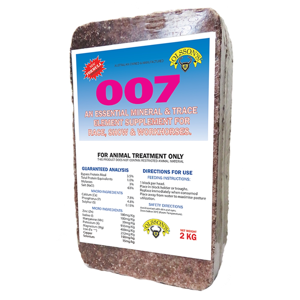 Olsson’s 007 Mineral Block is a multi purpose supplement for horses grazing on all pastures. It is an essential mineral and trace element supplement providing all horses extra vigor, stamina, muscle and bone strength. The balanced levels of calcium and phosphorus in the block builds strong bones in foals, and replenishes the minerals drawn from the mare’s reserves during pregnancy. Perfect for working and eventing horses. 007 is the perfect way to maintain mineral and trace element balance in all horses.