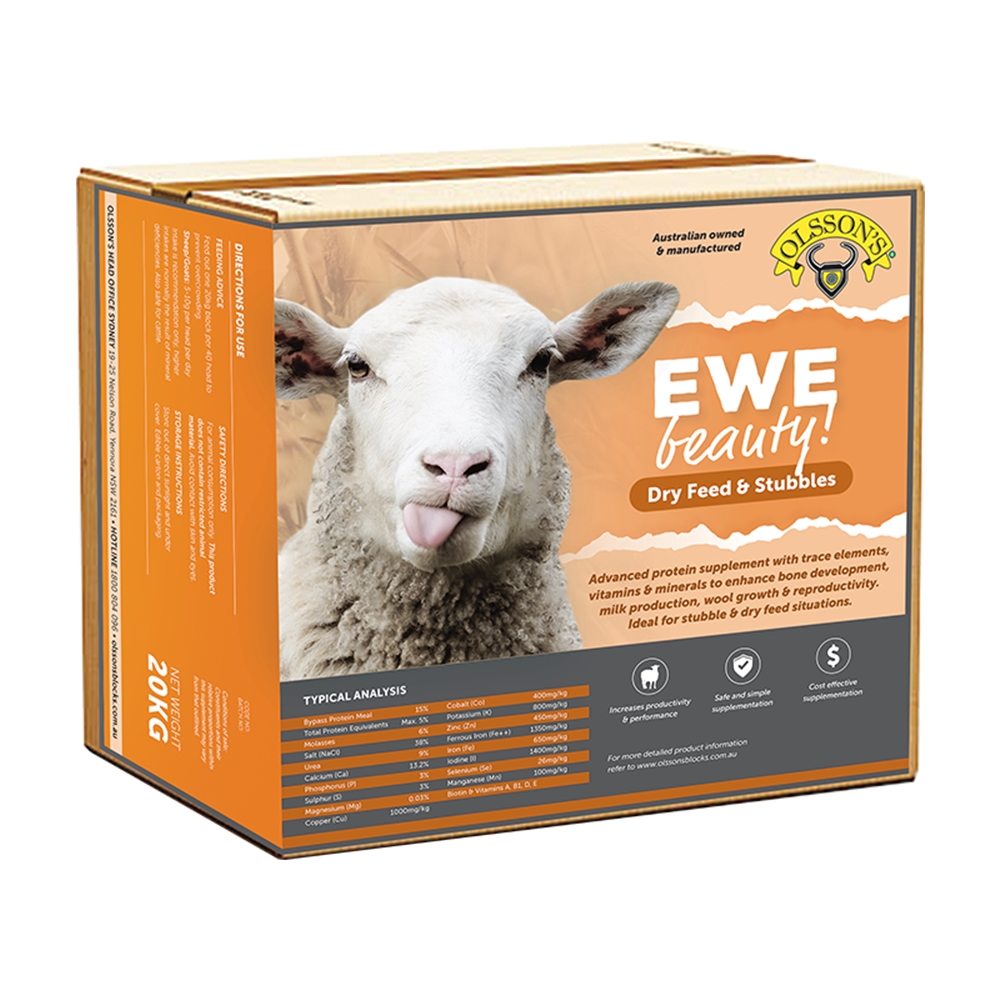 Stubbles are a feed source that starts as high quality but depletes quickly (as the sheep clean up the spilt grain) so producers need to keep this characteristic in mind to ensure a good source of nutrition is maintained. Olsson’s Ewe Beauty Dry Feed & Stubbles is a high protein, multi nutrient supplement specifically for use with stubbles & during the dry season. Like Ewe Beauty All Seasons it contains a balanced array of trace elements, vitamins & minerals, providing targeted supplementation for sheep. It supports bone development, milk production, wool growth & reproductivity. Added benefits include increasing lambing survival rates, decreasing stock loss, and providing optimal feed conversion.