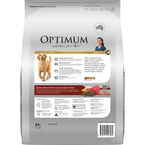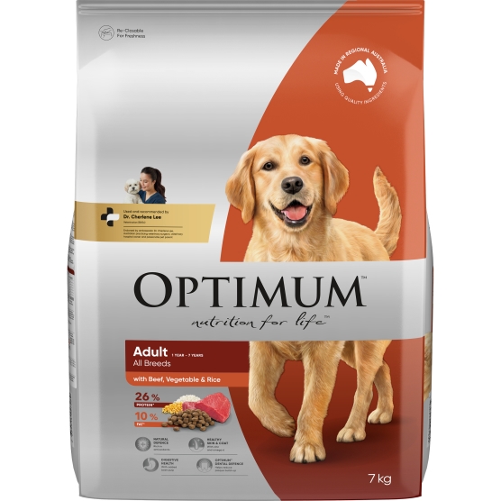 OPTIMUM™ Adult All Breeds with Beef, Vegetables & Rice dry food is expertly formulated with high quality protein sources and wholegrains to provide a nutritionally complete and balanced meal that your dog can enjoy every day.
