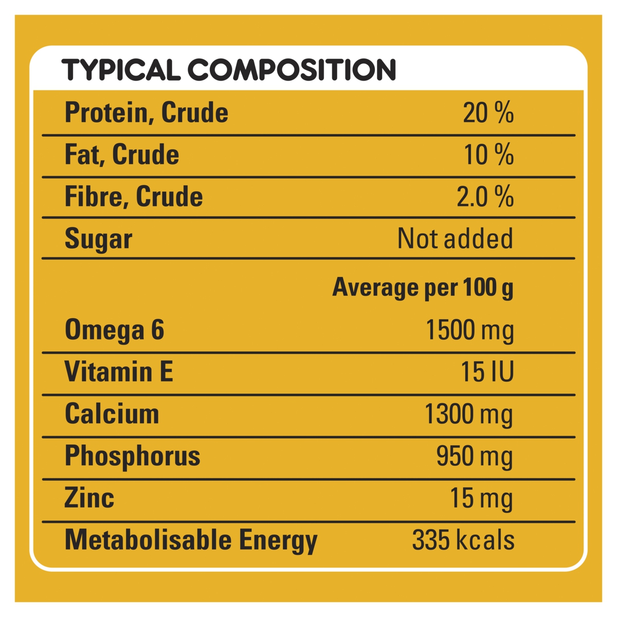 Protein, Crude 20% Fat, Crude 10% Fibre, Crude 2.0% Sugar Not added Average per 100 g Omega 6 1500 mg Vitamin E 15 IU Calcium 1300 mg Phosphorus 950 mg Zinc 15 mg Metabolisable Energy 335 kcals