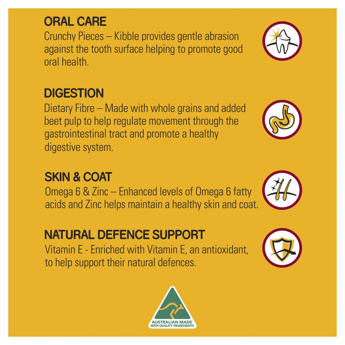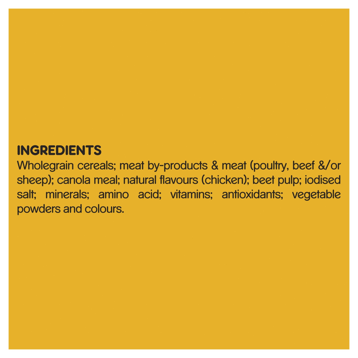 Wholegrain cereals; meat & meat by-products (poultry, beef,&/or sheep); canola meal; natural flavours (chicken); beet pulp; iodised salt; minerals; vitamins; amino acid; antioxidants; vegetable powders and colours.