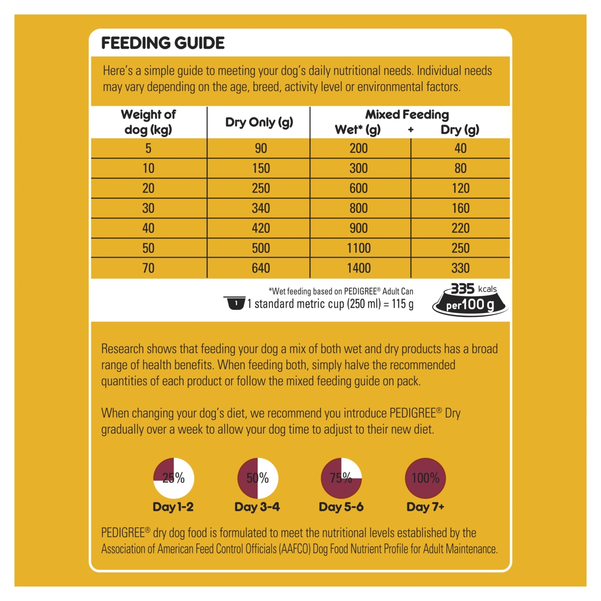 Heres a simple guide to meeting your puppys daily nutritional needs. Individual needs may vary depending on the breed, activity level or environmental factors. When changing your puppys diet, we recommend you introduce PEDIGREE Puppy Dry gradually over a week to allow your puppy time to adjust to their new diet.