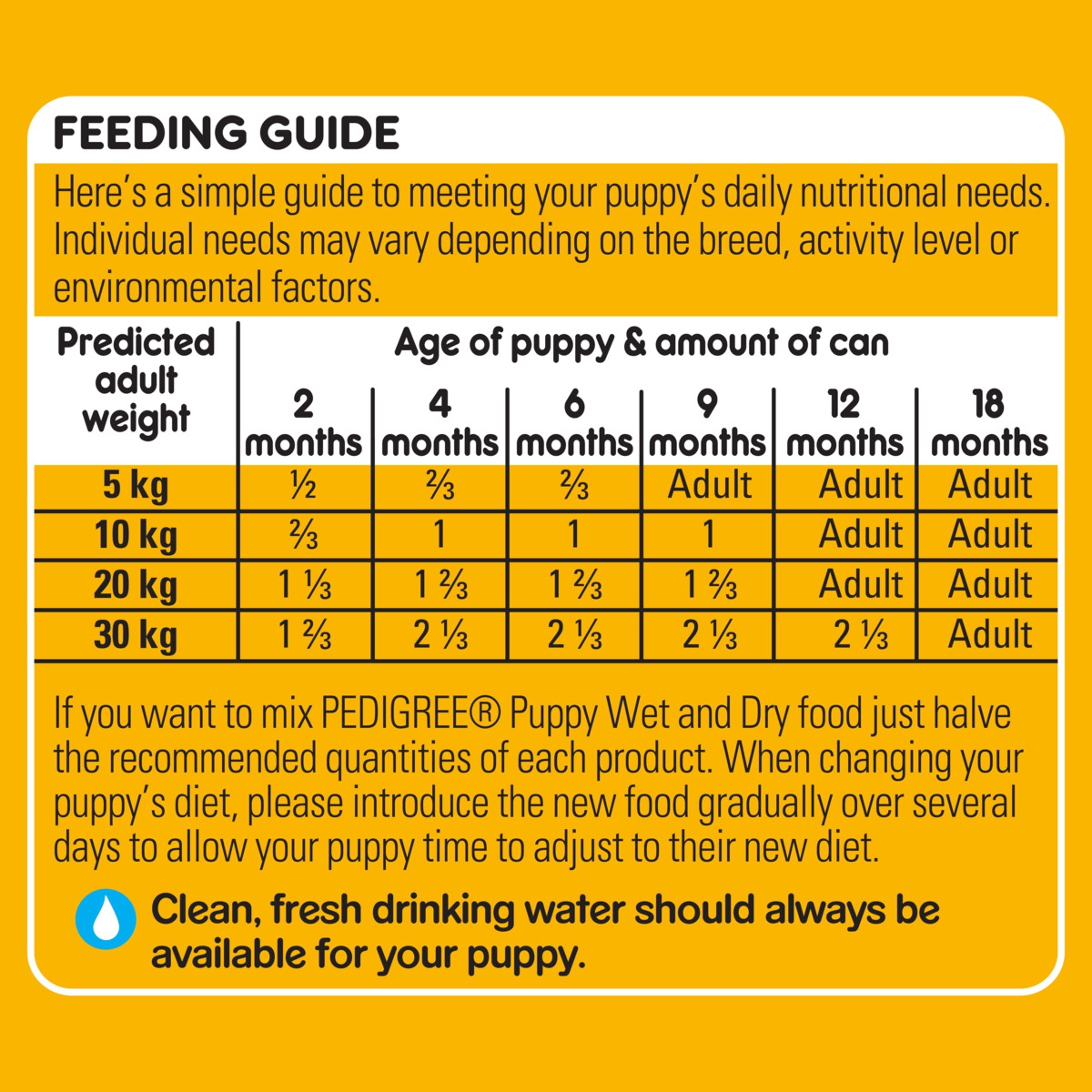 If you want to mix PEDIGREE Puppy Wet and Dry food just halve the recommended quantities of each product. When changing your puppy’s diet, please introduce the new food gradually over several days to allow your puppy time to adjust to their new diet.