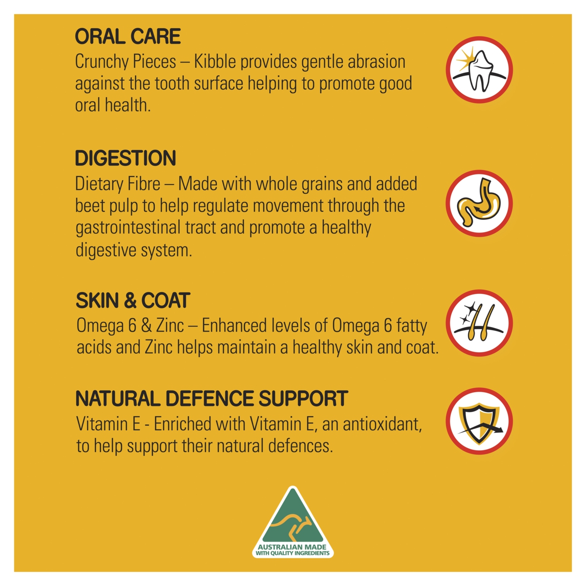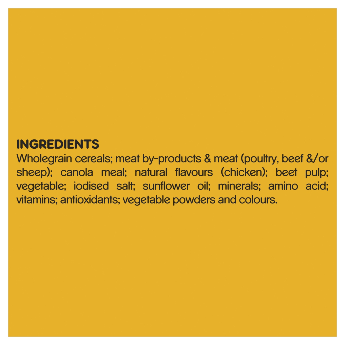 Wholegrain cereals; meat by-products & meat (poultry, beef &/or sheep); canola meal; natural flavours (chicken); beet pulp; vegetable; iodised salt; sunflower oil; minerals; amino acid; vitamins; antioxidants; vegetable powders and colours.
