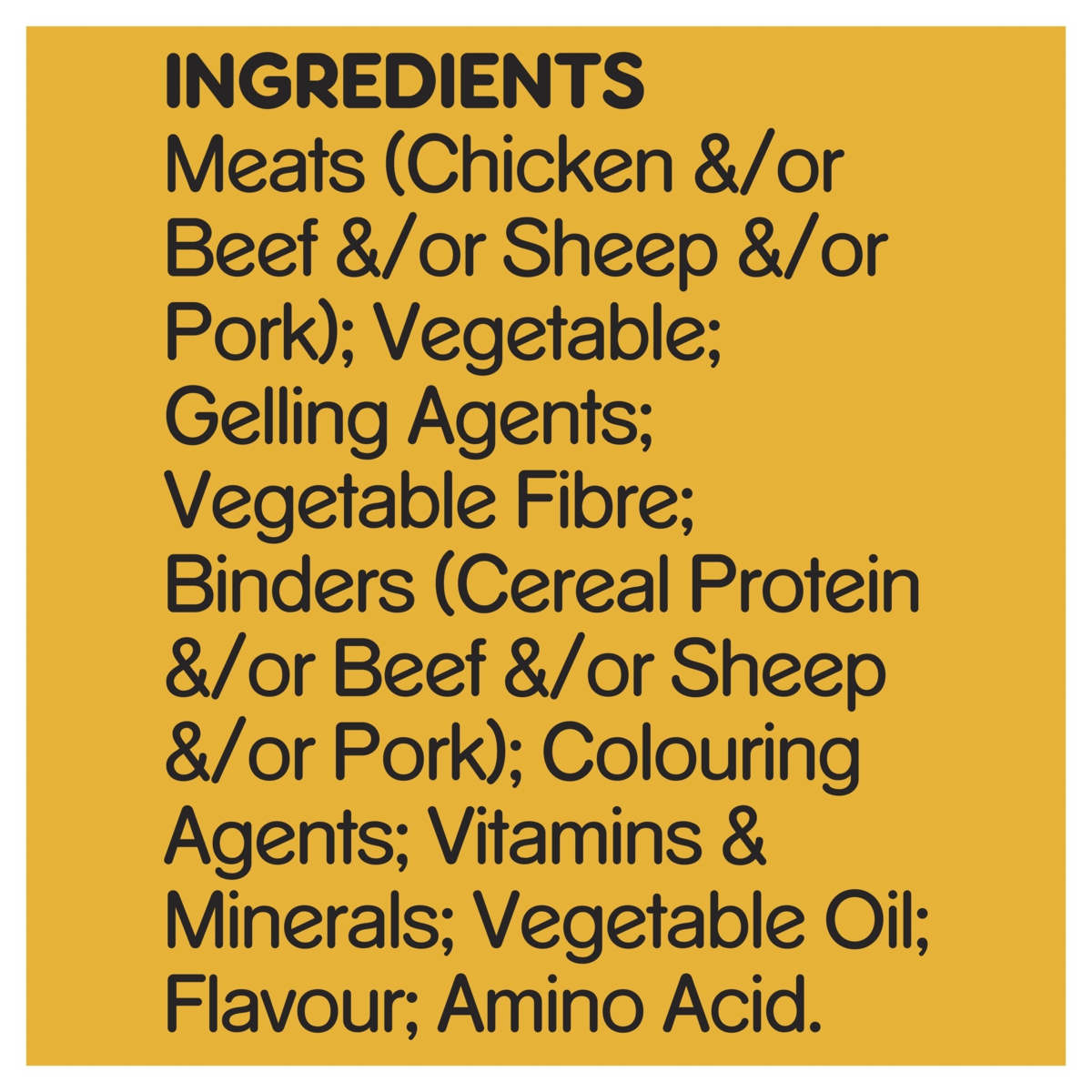 Meats (Chicken &/or Beef &/or Sheep &/or Pork); Vegetable; Gelling Agents; Vegetable Fibre; Binders (Cereal Protein &/or Beef &/or Sheep &/or Pork); Colouring Agents; Vitamins & Minerals; Vegetable Oil; Flavour; Amino Acid.