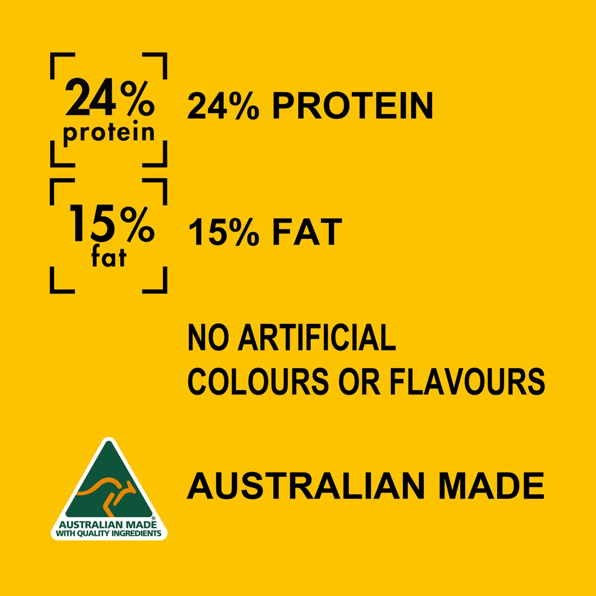 Wholegrain cereals, meat & meat by-products (poultry, beef &/or lamb &/or sheep), natural flavours (chicken), beet pulp, iodised salt, minerals (iron, zinc, copper, potassium, iodine and selenium), vitamins (A, D3, E, B1, B2, B3, B5, B6, B9, B12 and choline), sunflower oil, antioxidants