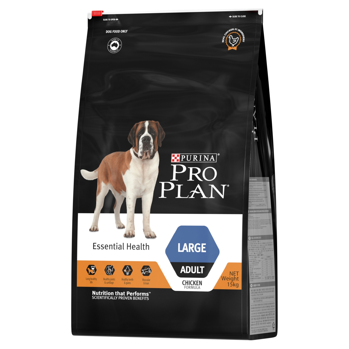 PRO PLAN® Essential Health Large Adult is a complete and balanced dry dog food for large size adult dogs. It has been developed by vets and nutritionists at PURINA® to give your large-sized breed dog the best nutrients for their health needs.