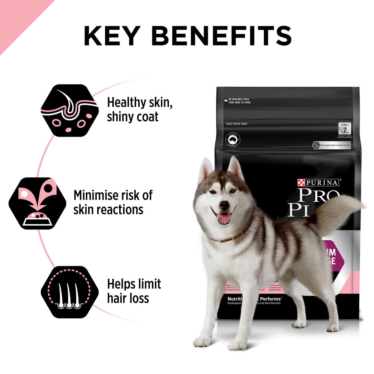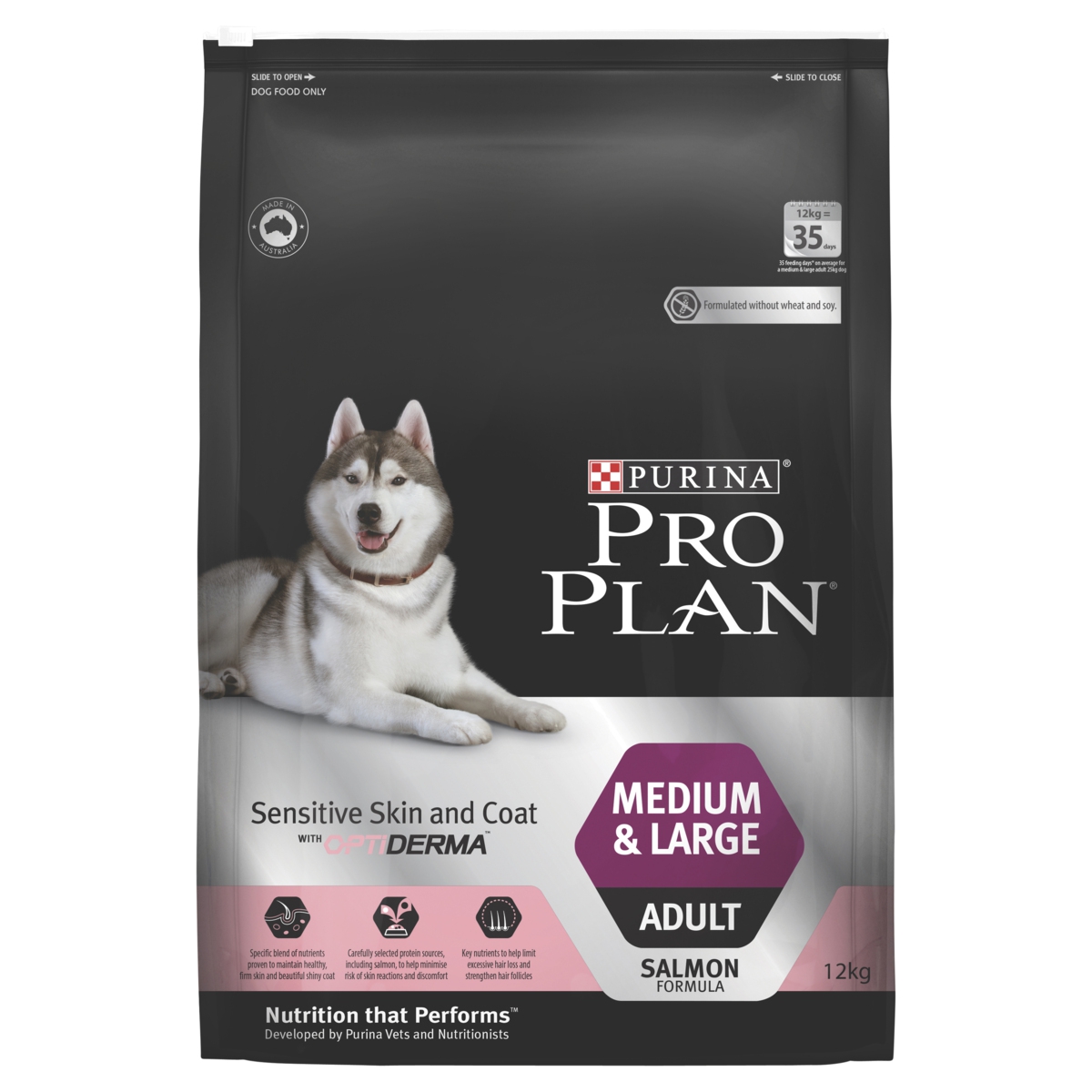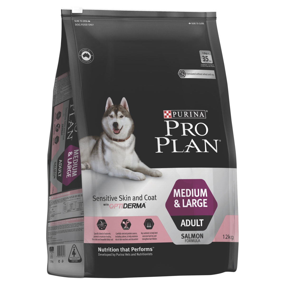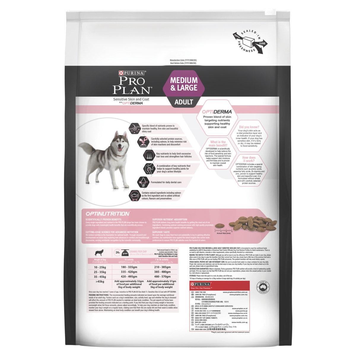 Salmon, rice, oats, dehydrated salmon, maize gluten meal, barley, animal fat preserved with mixed-trocopherols (form of vitamin E), animal digest, pea protein, beet pulp, minerals, vitamins, amino acids and natural flavours (including calcium, phosphorous, sodium, chloride, potassium, magnesium, manganese, copper, zinc, iron, iodine, selenium, vitamin A, vitamin B1, vitamin B2, vitamin B3, folic acid, vitamin B5, vitamin B6, vitamin B12, vitamin C, vitamin D, vitamin E, choline) fish oil and natural antioxidants.