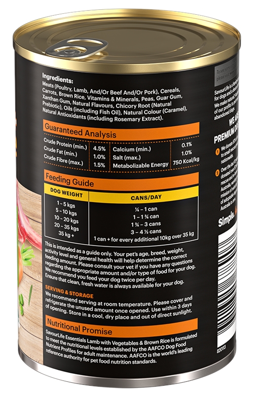 Essentials Lamb with Veggies & Brown Rice is an all-natural, Australian-made wet food, made from high-quality Australian meat as the recipe’s first ingredient. Packed with seasonal vegetables such as carrots and peas, fish oil, plus vitamins, minerals and natural pre-biotics and tailored to meet the nutritional needs of adult dogs. There are absolutely no artificial flavours, colours or preservatives.