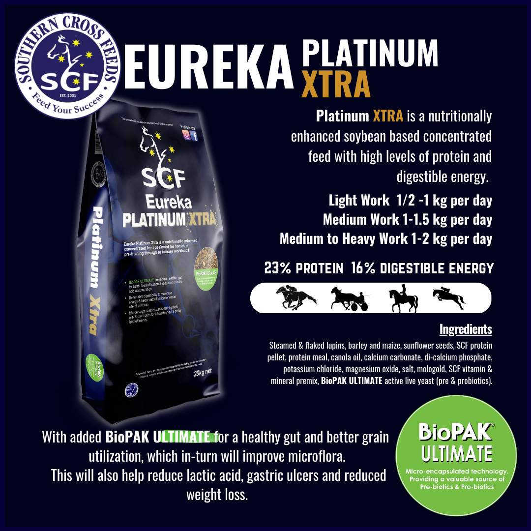 Eureka Platinum Xtra is an “oats free” feed concentrate specifically designed for the equine athlete. Eureka Platinum Xtra is ideal for horses undertaking intense training such as thoroughbred and harness racing. Eureka Platinum Xtra is also formulated to have additional grains such as oats, corn etc to meet their energy requirements. Eureka Platinum Xtra is fortified with minerals as well as live yeast culture BioPAK ULTIMATE