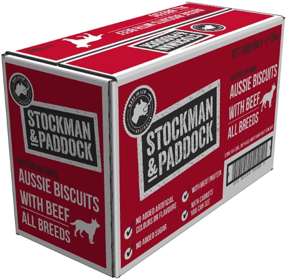 Stockman & Paddock Aussie Beef Dog Biscuits 10kg is a natural Australian made dog biscuit. Made with real meat protein, these big, oven-baked biscuits contain no sugar, and no artificial colours or flavours. Made in Australia from locally sourced ingredients, Stockman & Paddock Aussie Beef Dog Biscuits 10kg is suitable for adult dogs of all breeds.