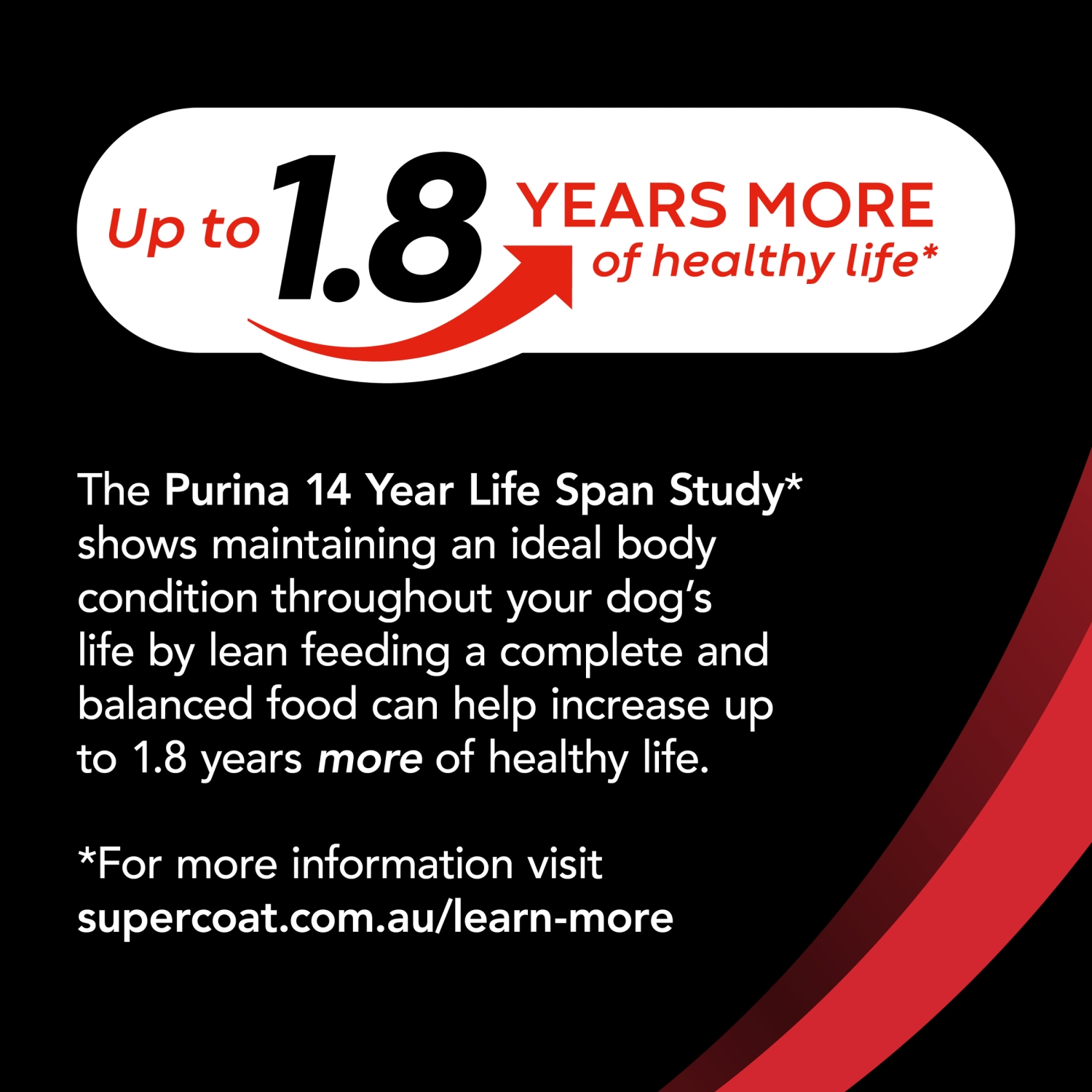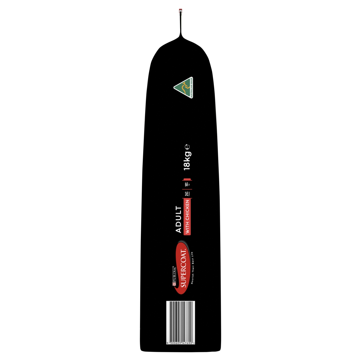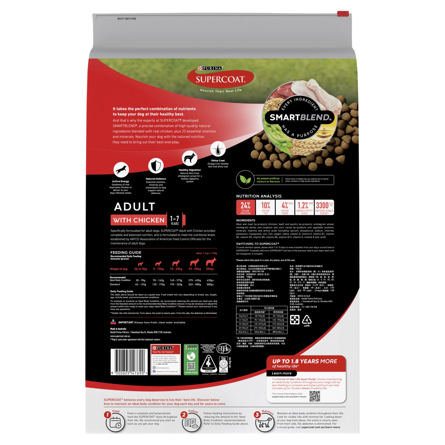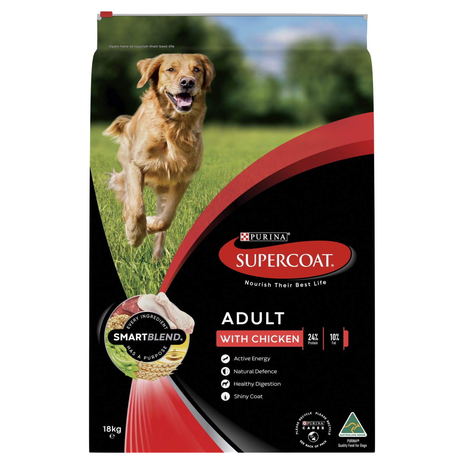 Our SUPERCOAT® SMARTBlend® recipes are specially tailored to suit your dogs life stage and specific needs, so you can be sure theyre getting the right nourishment to support overall health and wellbeing. • Active Energy - Goodness of real Australian Chicken to deliver to your dogs lifestyle needs • Natural Defence - Essential vitamins, minerals and antioxidants to help support natural defences • Healthy Digestion - Natural fibre from wholegrain cereal for a healthy digestive system • Shiny Coat – Omega 6 for healthy skin and shiny coat • No added artificial colours or flavours • Proudly made in Australia