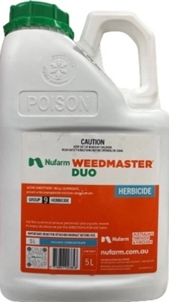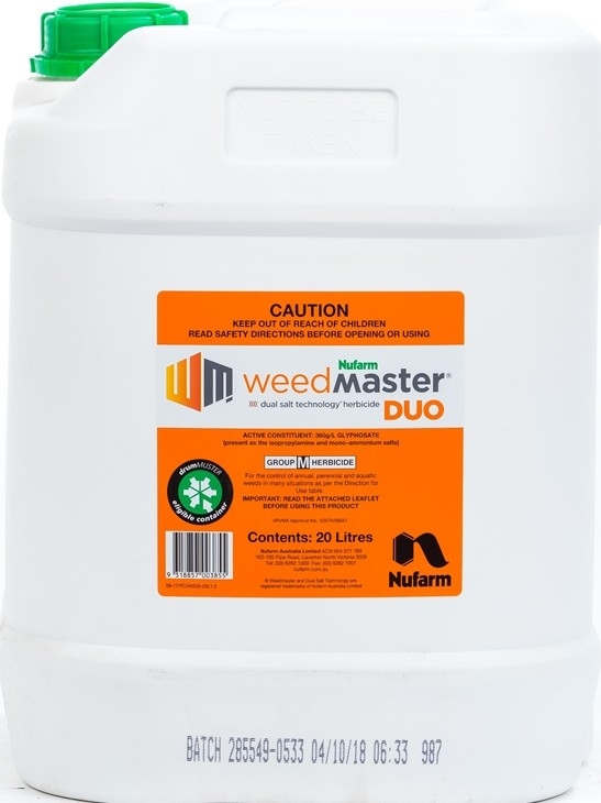 NUFARM weedmaster DUO DELIVERS: • Fast, reliable, broad spectrum weed control • A 'fully loaded' surfactant that enables excellent weed control when applied in high water rate applications • Excellent tank mix compatibility • Improved plant uptake due to Dual Salt Technology® • Aquatically approved surfactant for use near drains rivers and creeks